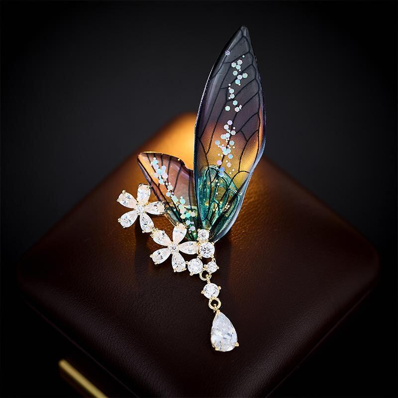 ブローチ レディース ファッション 軽やか 高級感 蝶 羽根 ジルコニア 銅製 電気メッキ加工 昆虫モチーフ 蜻蛉 上質 エレガント アウター コサージュ アクセサリー ピン ブルー グリーン