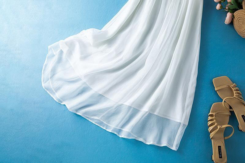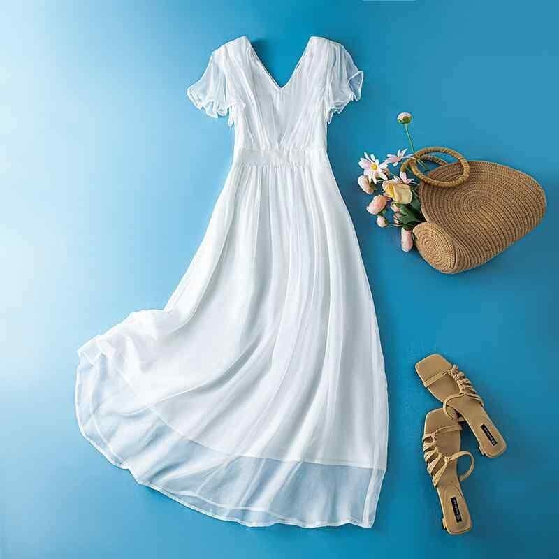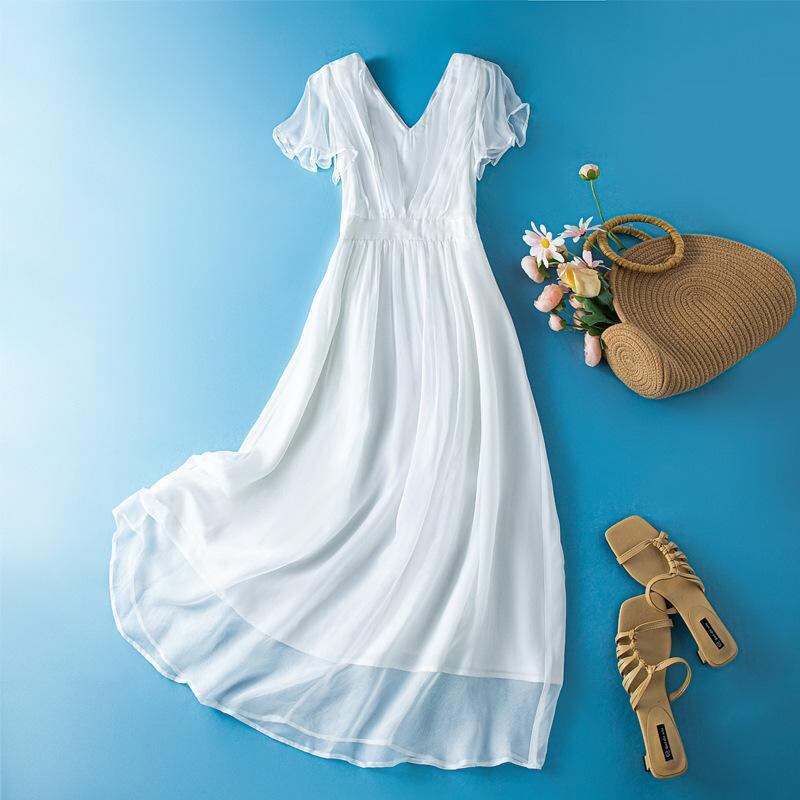 ワンピース レディース シルク Vネック ロング丈 フレア 半袖 フリルスリーブ ウエストリボン ボヘミアン スタイルアップ 上品 エレガント 通勤 オフィス ビーチ リゾート 春夏 無地