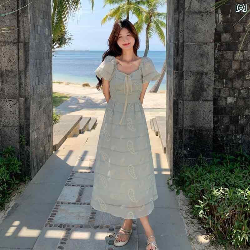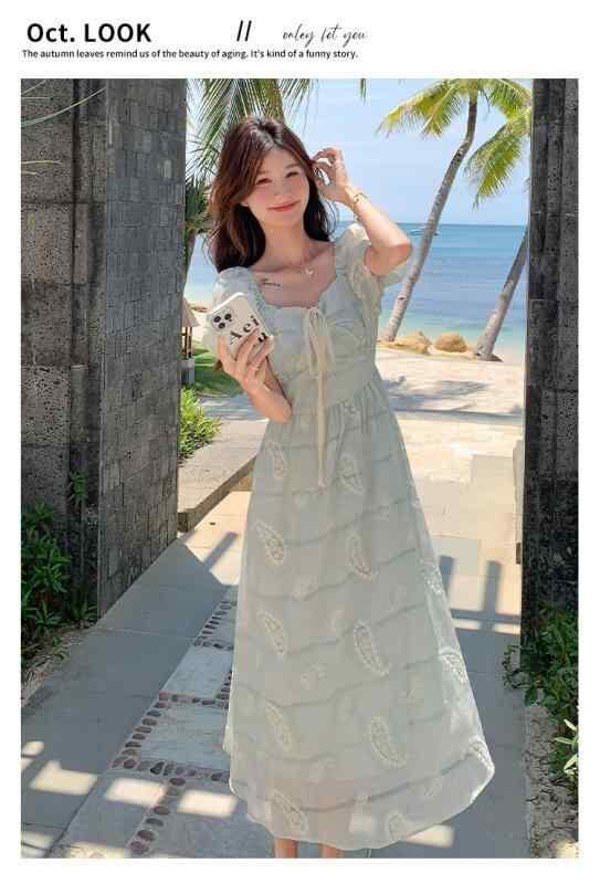 ワンピース フレンチ フェミニン 上品 きれいめ 通勤 普段使い 刺繍 リボン パフスリーブ スクエアネック Aライン ロング丈 マキシ丈 ハイウエスト ポリエステル 春夏