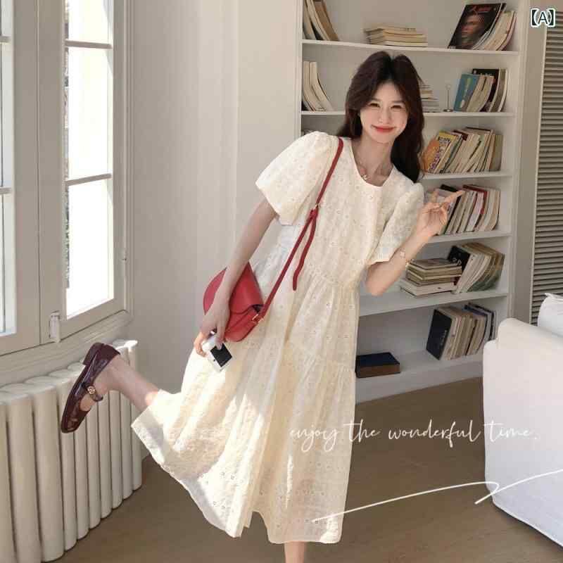 ワンピース レディース オフホワイト フレンチスタイル レース 透かし彫り ジャカード パフスリーブ 半袖 マキシ丈 Aライン ハイウエスト ラウンドネック エレガント 上品 優雅 リゾート 旅行 ナチュラル デイリー ポリエステル 春夏