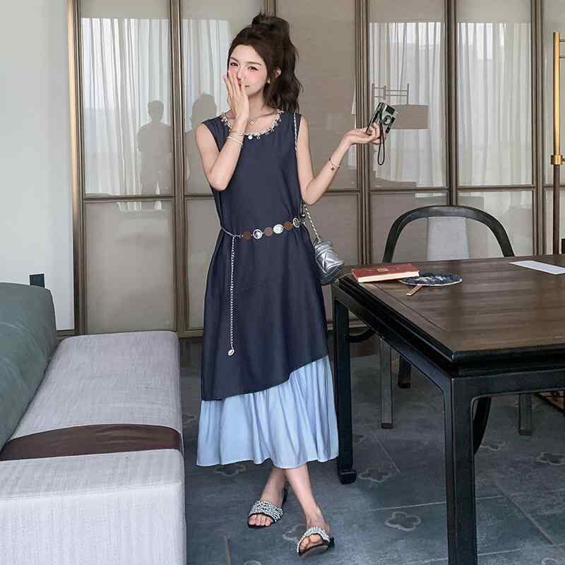 ワンピース ネイビー ブルー レトロ ボヘミアン アシンメトリー ノースリーブ スパンコール 貝殻モチーフ フェイクレイヤード ロング丈 ゆったり クルーネック 春夏 ポリエステル ドレス