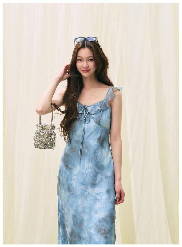 ワンピース レディース 夏 フレンチスタイル スクエアネック フリル 水墨画風プリント 肌理模様 ロング丈 シフォン ノースリーブ ポリエステル ボタニカル柄 裏地付き プルオーバー フェミニン ブルー グリーン