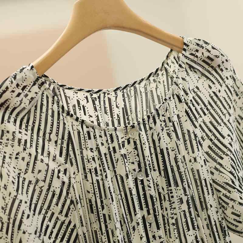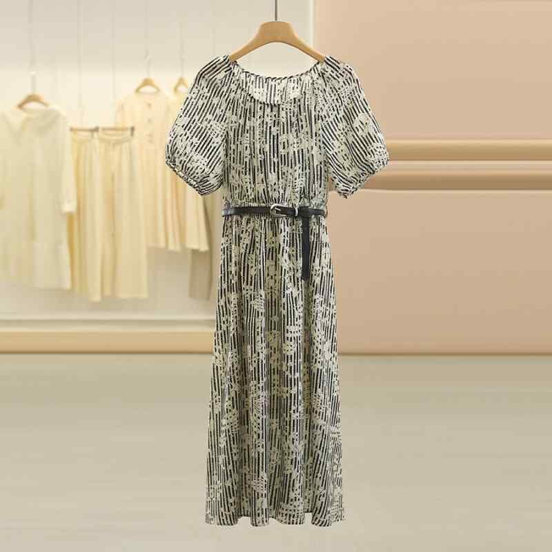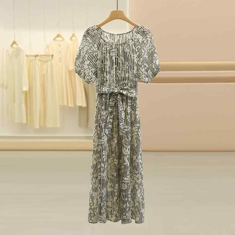 ワンピース レディース 韓国風 ファッション ストライプ 縞柄 ウエストマーク ハイウエスト Aライン ミディ丈 半袖 ショートスリーブ ラウンドネック シェニール素材 レーヨン 綿 通勤 オフィス きれいめ 春夏
