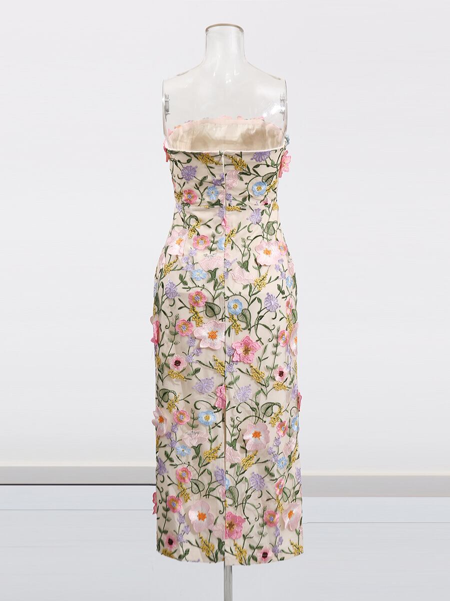 ワンピース ドレス レディース 夏 ピンク 花柄刺繍 ベアトップ風 ノースリーブ ロング丈 タイトシルエット エレガント 通勤 フォーマル 上質 ポリエステル 高級感