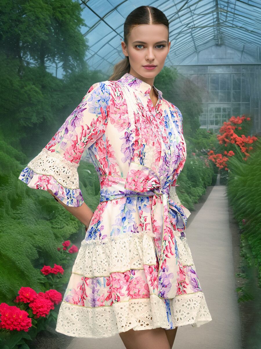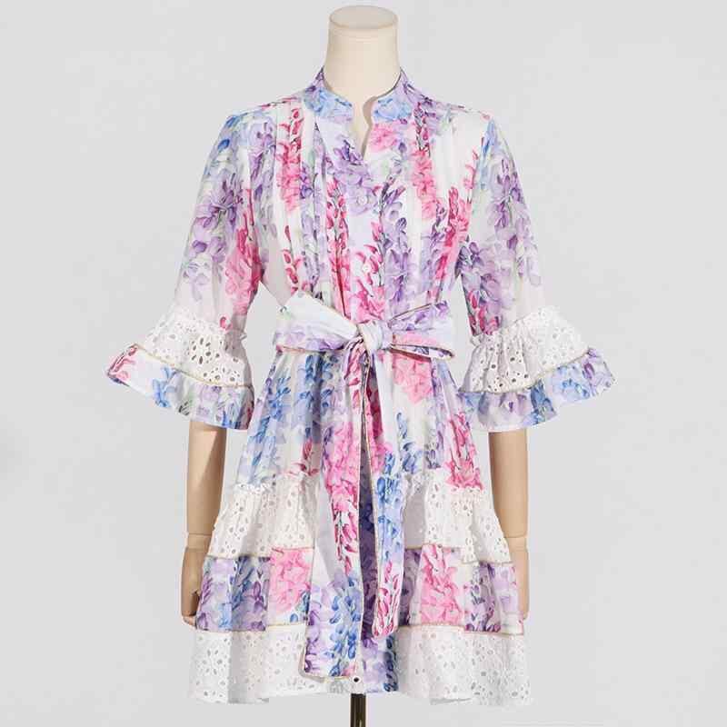 ワンピース レディース 春夏 リゾート 花柄プリント 刺繍 ウエストマーク 細見え 紐付き ミニ丈 カジュアル お出かけ 旅行 スタイルアップ Aライン フレアスリーブ ハイウエスト パープル ポリエステル