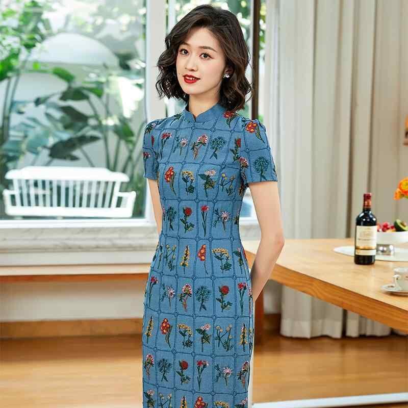 チャイナドレス レディース 綿麻 リネン 刺しゅう 普段使い 涼しい 夏物 中華風 ロング丈 スタンドカラー 半袖 レトロモダン ブルー