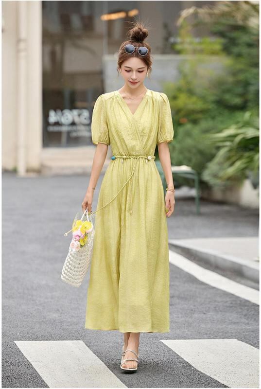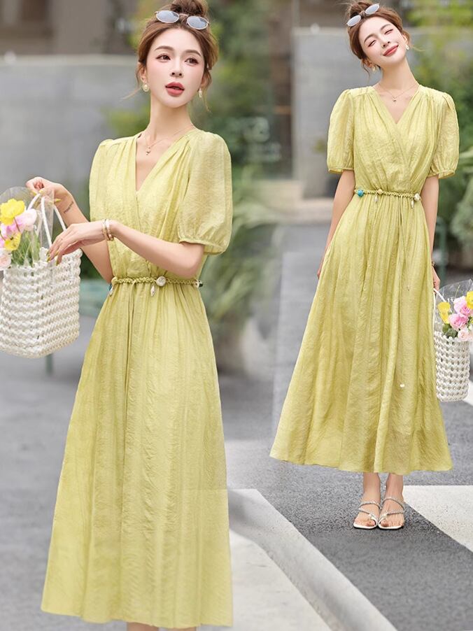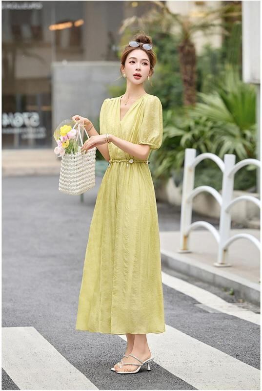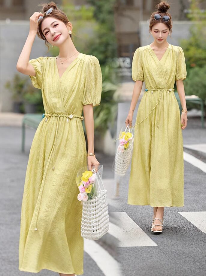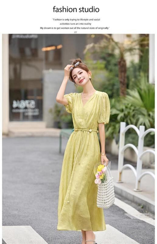 ワンピース レディース Vネック パフスリーブ 半袖 ハイウエスト ウエストマーク Aライン ロング丈 着痩せ エレガント フレンチシック 通勤 オフィス デイリー カジュアル プルオーバー 無地 ポリエステル 春夏