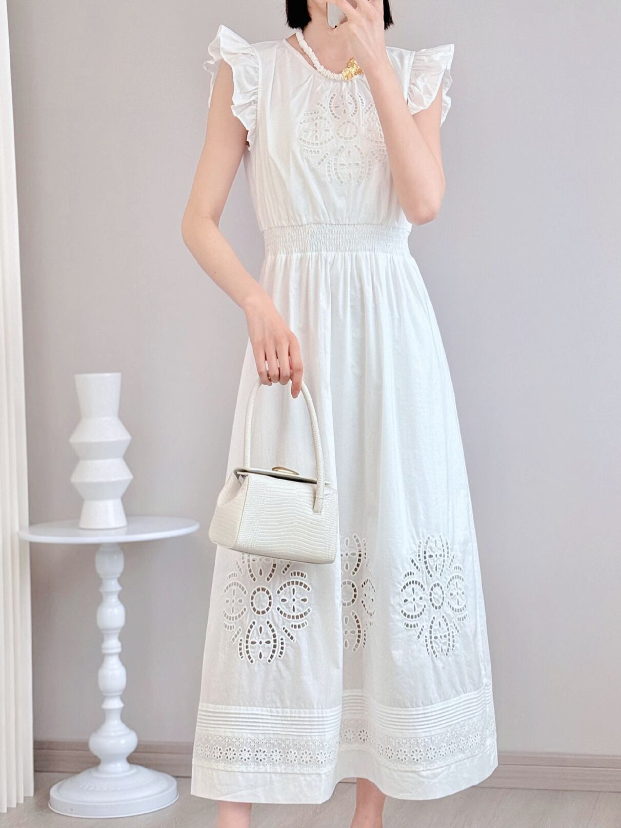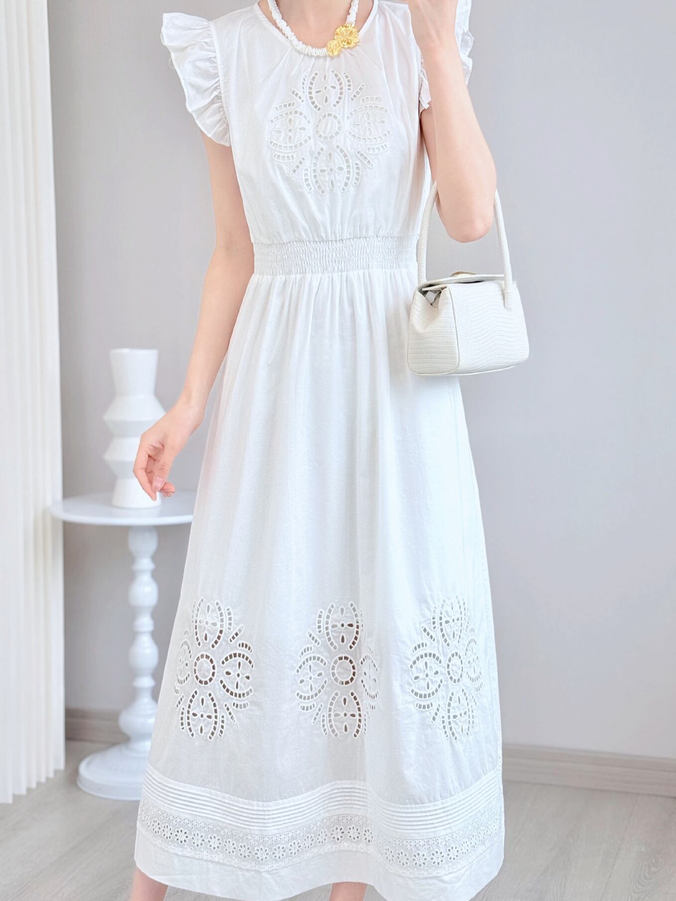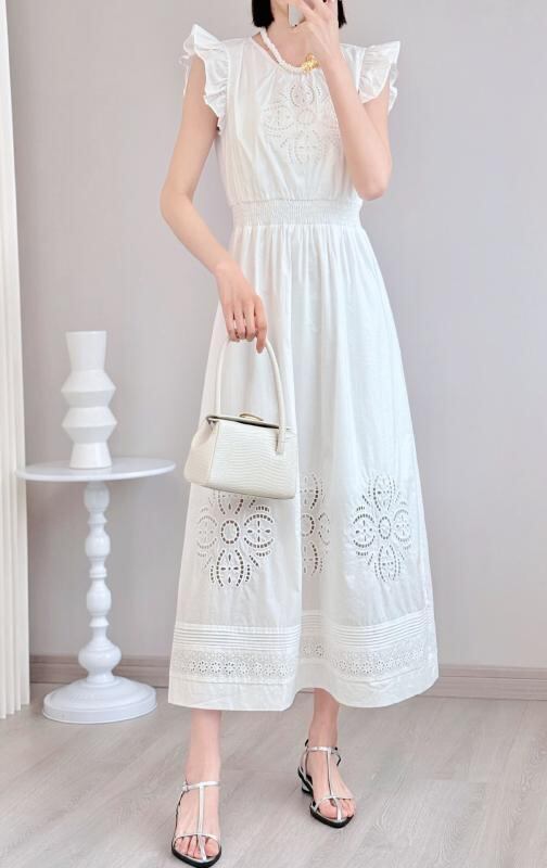 ワンピース 春夏 フレンチ リゾート 花柄 刺繍 カットワーク コットン ウエストマーク フレンチスリーブ Aライン ミディ丈 ビーチウェア 上品 きれいめ 通勤スタイル