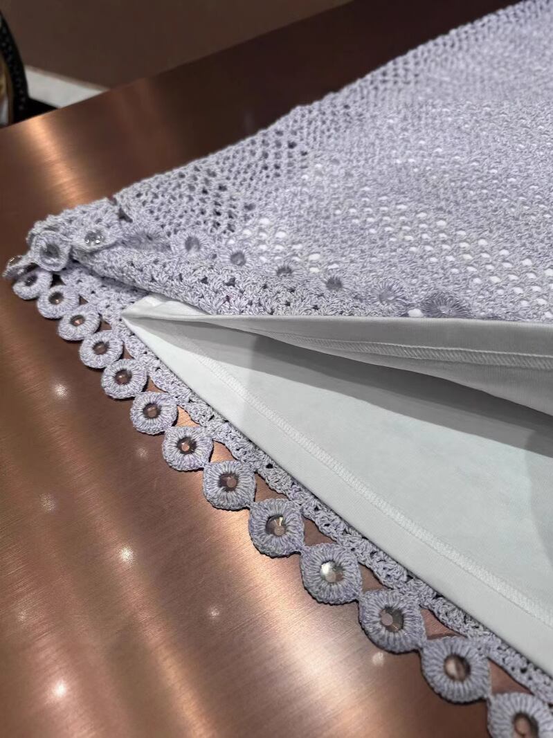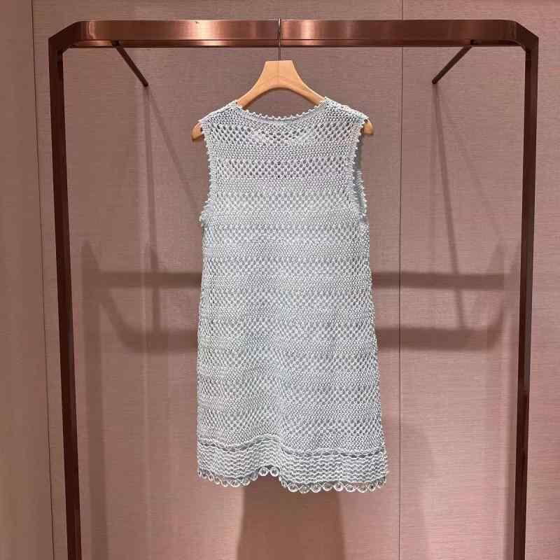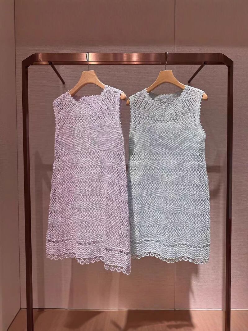 ワンピース ニット ノースリーブ 透かし編み クロシェ ラウンドネック ミディ丈 タイトシルエット バックオープン デザイン性 甘辛 若見え ポリエステル 淡いパープル 淡いブルー 上品カジュアル 春夏
