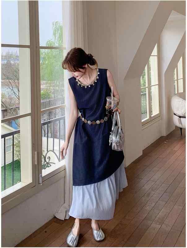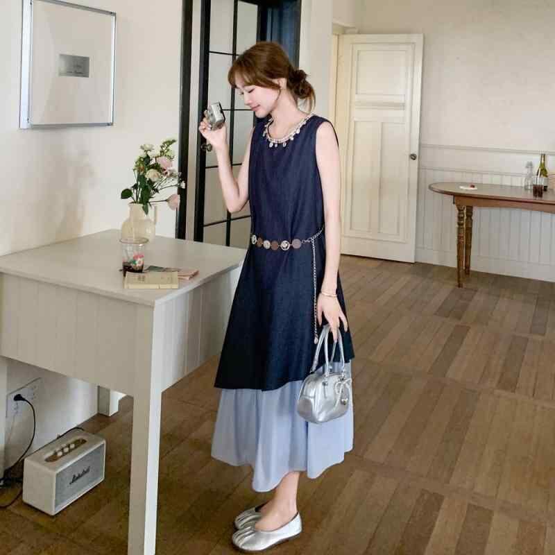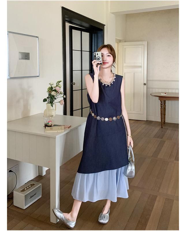ワンピース レディース フェイクツーピース 切り替え デニム ロング丈 Aライン ハイウエスト 細見え ポロ襟 パフスリーブ 上品 エレガント カジュアル フェミニン かわいい 春夏