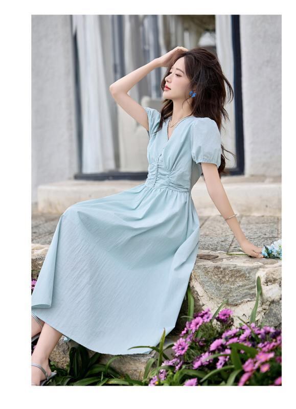 ワンピース Vネック プリーツ ウエストリボン ミディ丈 Aライン パフスリーブ 細見え効果 ポリエステル 上品 通勤 春夏 ブルー イエロー オフホワイト