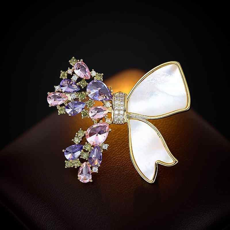 ブローチ レディース 女性用 高級感 天然シェル ピンクパープル ジルコニア リボン 軽やか 上品 デザイン 銅製 電気メッキ加工 スーツ チャイナドレス フォーマル パーティー 結婚式 アクセサリー ゴールド