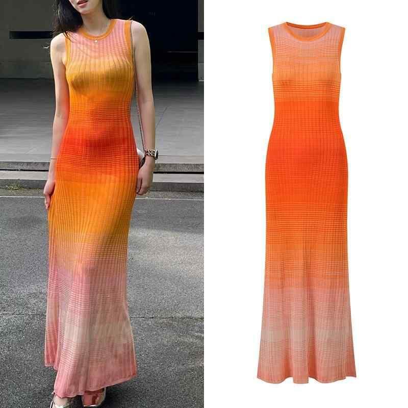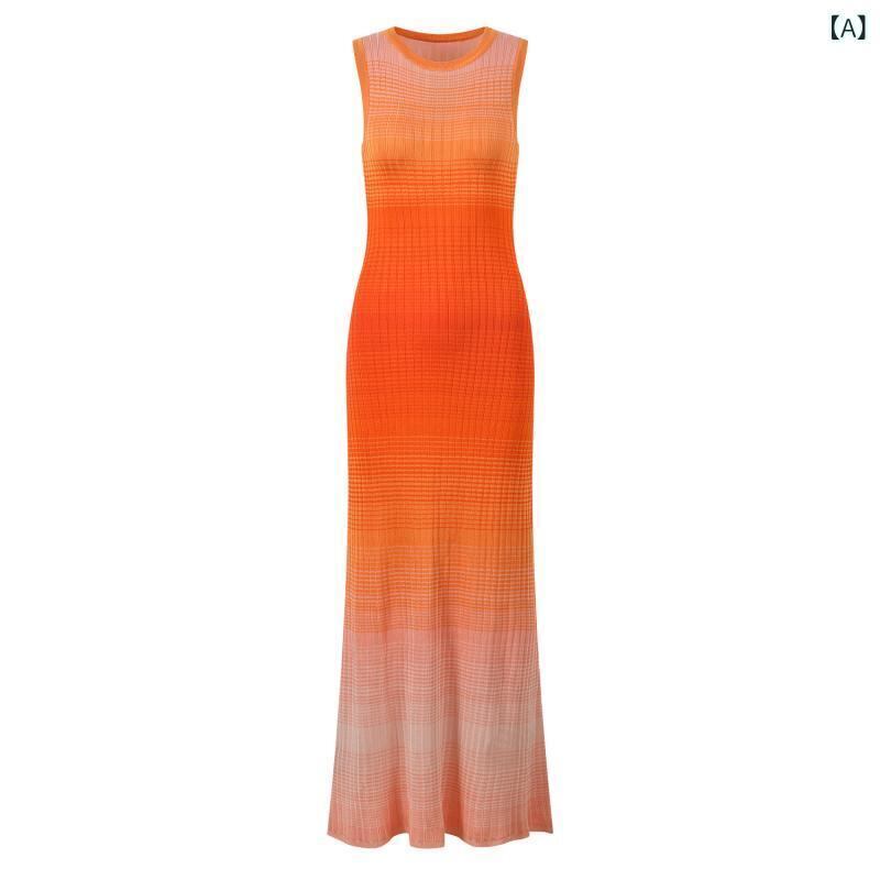 ワンピース レディース 春夏 グラデーションカラー ロマンチック オレンジ系 通勤 オフィス エレガント 上品 スタイルアップ 着痩せ効果 ラウンドネック ノースリーブ ロング丈 ドレス