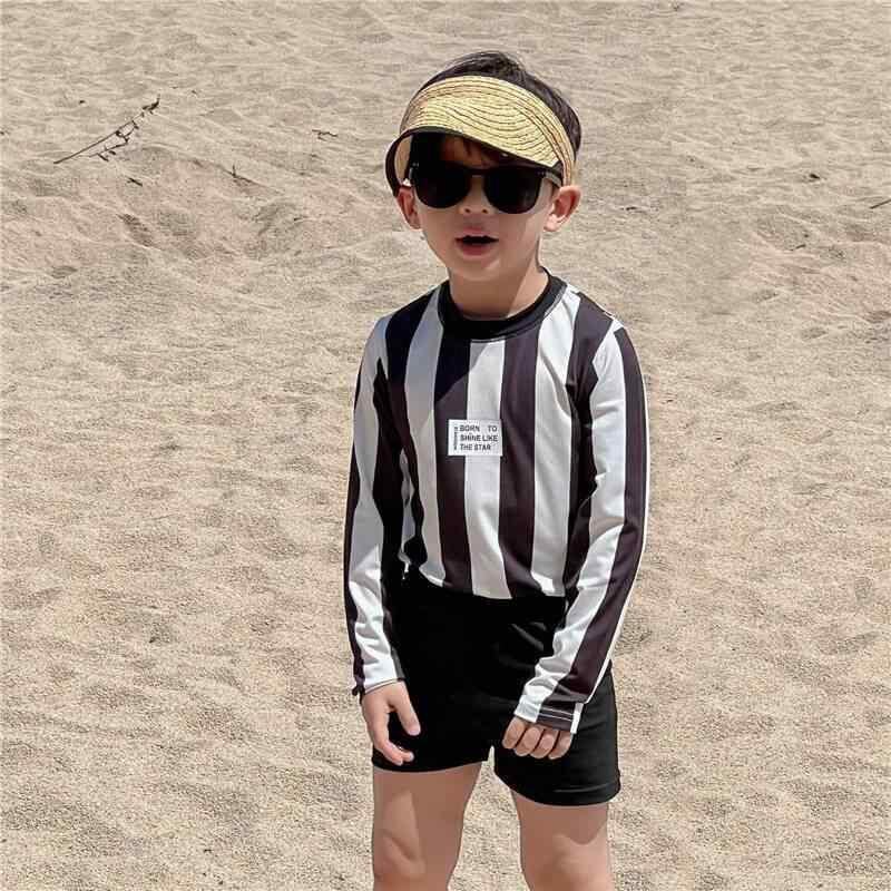 水着 男の子 キッズ ジュニア 春夏 速乾 モノトーン ストライプ セパレート 長袖 ショートパンツ 韓国風 UVカット プール 海 レジャー