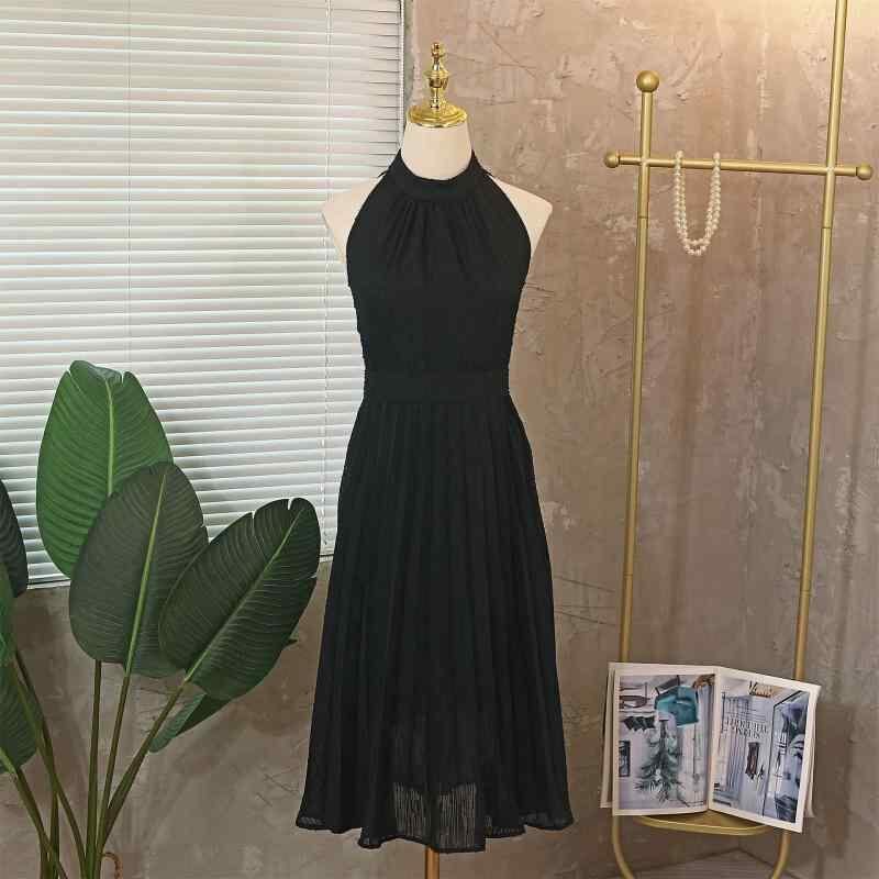 ワンピース レディース 夏 リゾート 旅行 ホルターネック ウエストマーク 着痩せ プリーツ ミディ丈 ノースリーブ ポリエステル 上品 レトロ ブラック