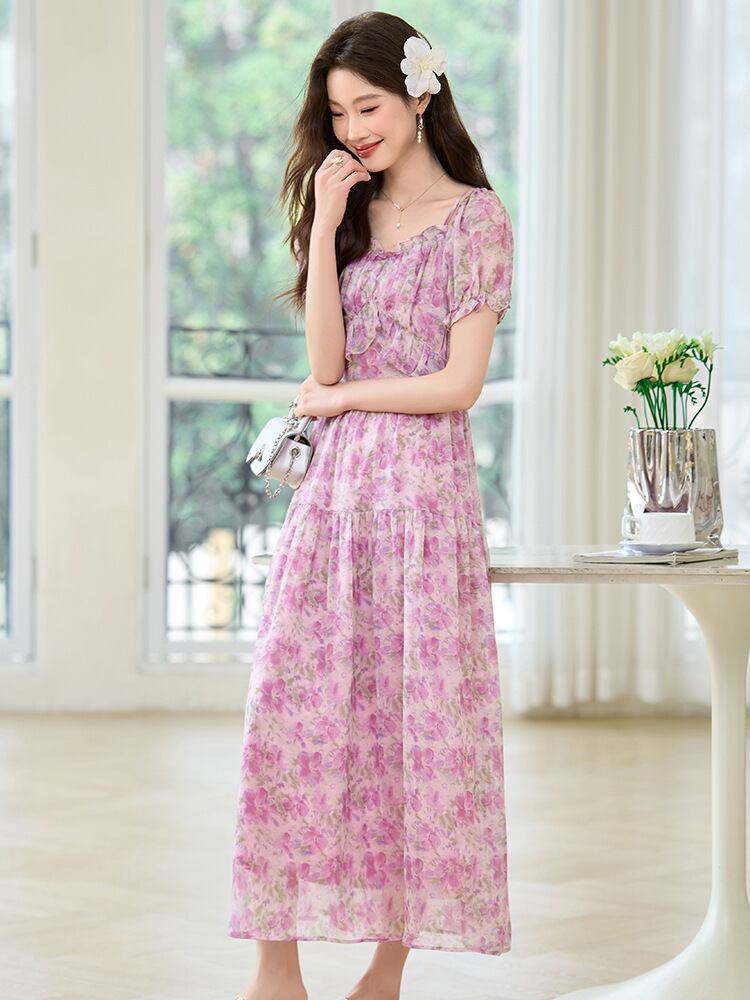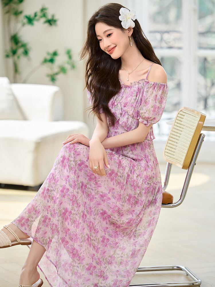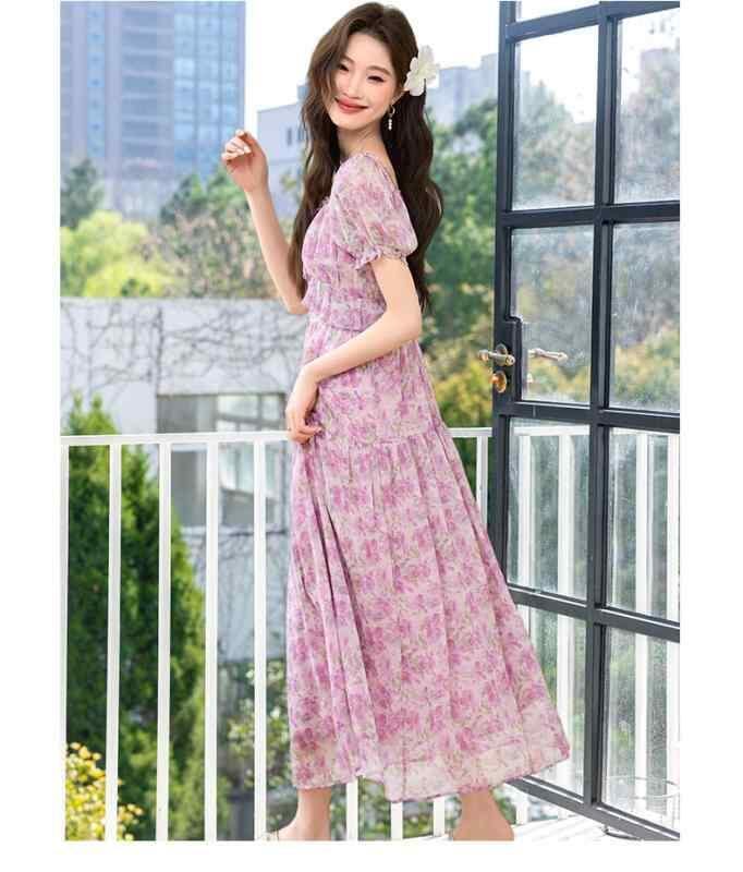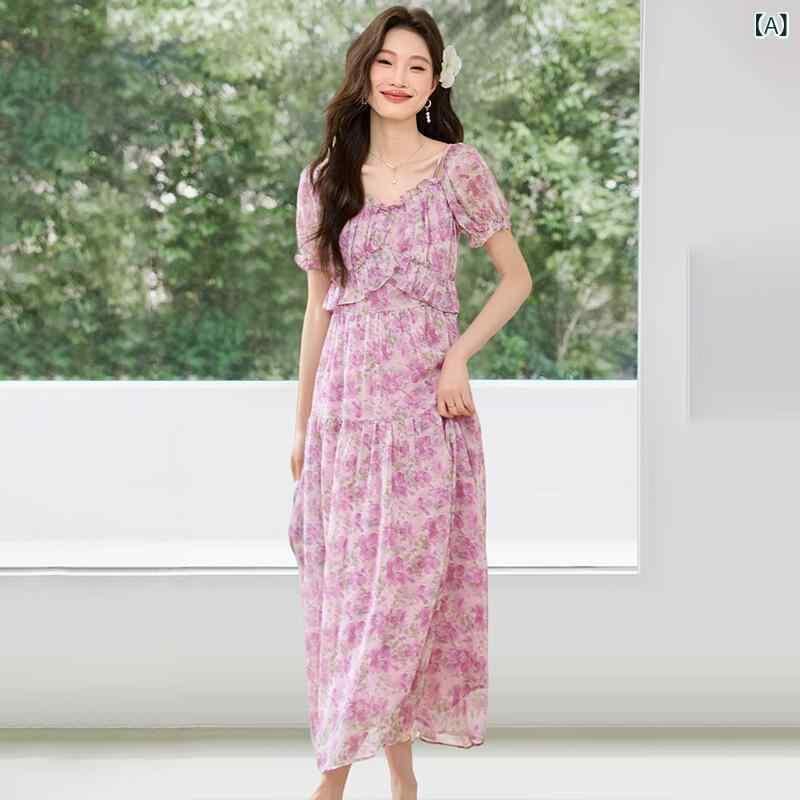 ワンピース レディース フレンチ 小花柄 シフォン キャミソール ロング リゾート ビーチ ウエストマーク 着痩せ パフスリーブ Vネック ハイウエスト Aライン ギャザー エレガント 通勤 春夏