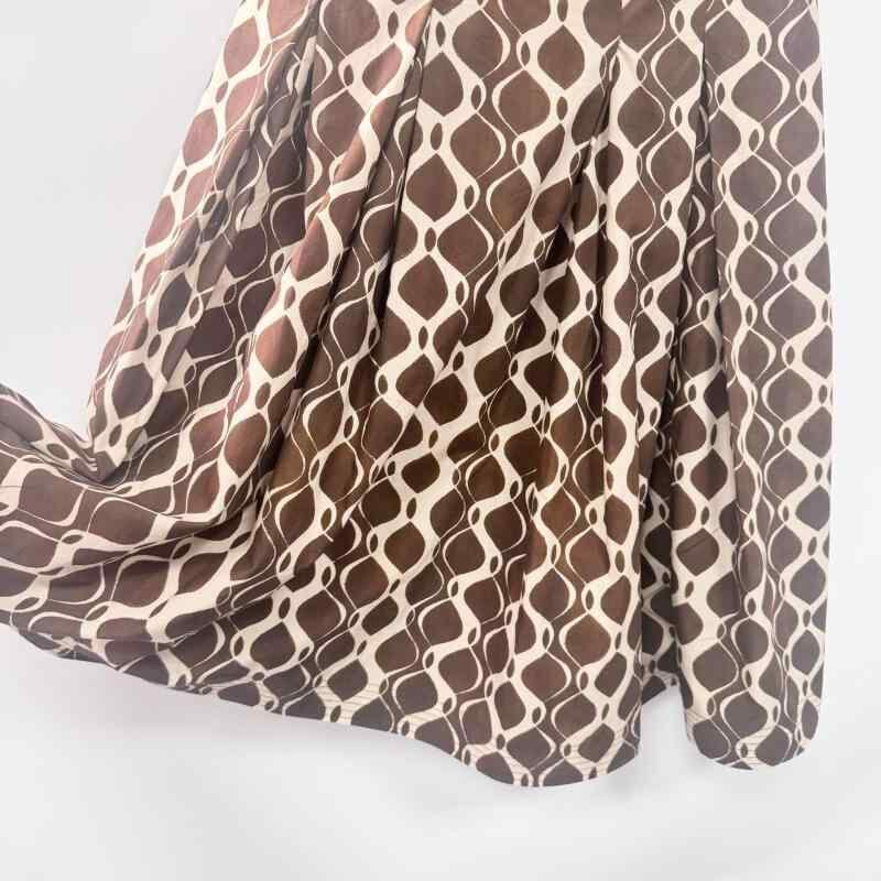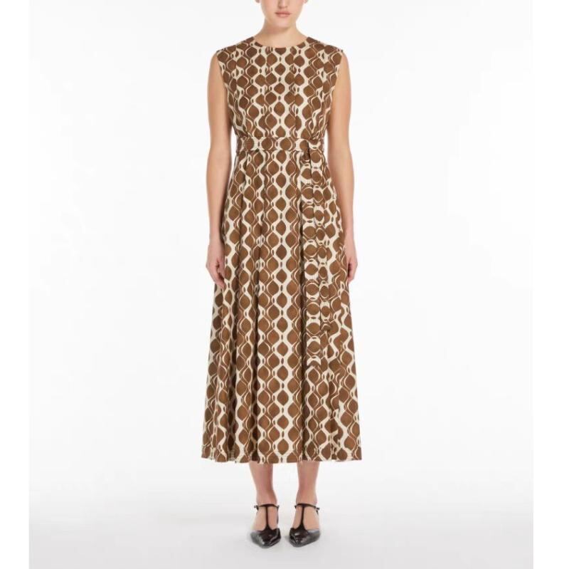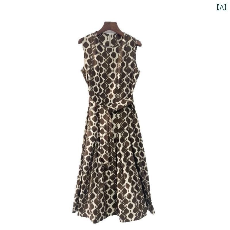 ワンピース レディース 春夏 通勤 オフィス きれいめ 上品 エレガント ラウンドネック ノースリーブ 綿100% プリント ミディ丈 Aライン ハイウエスト ポケット付き ブラウン ドレス