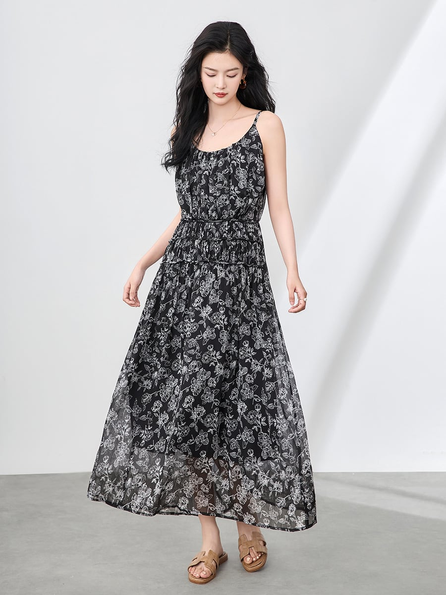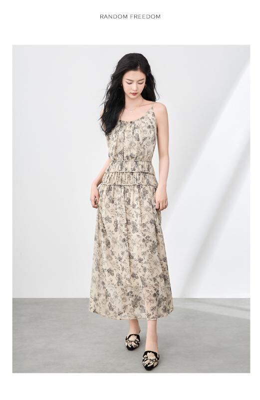 ワンピース レディース フレンチレトロ サマーリゾート 花柄プリント シフォン キャミソール Aライン ミディ丈 軽量 薄手 Uネック ノースリーブ エレガント 上品 通勤 オフィス アプリコット ブラック