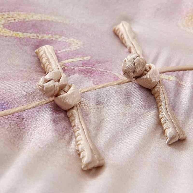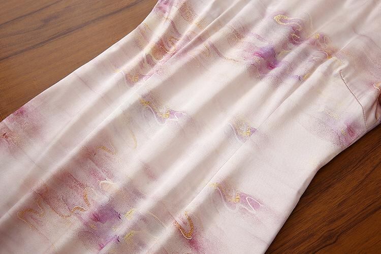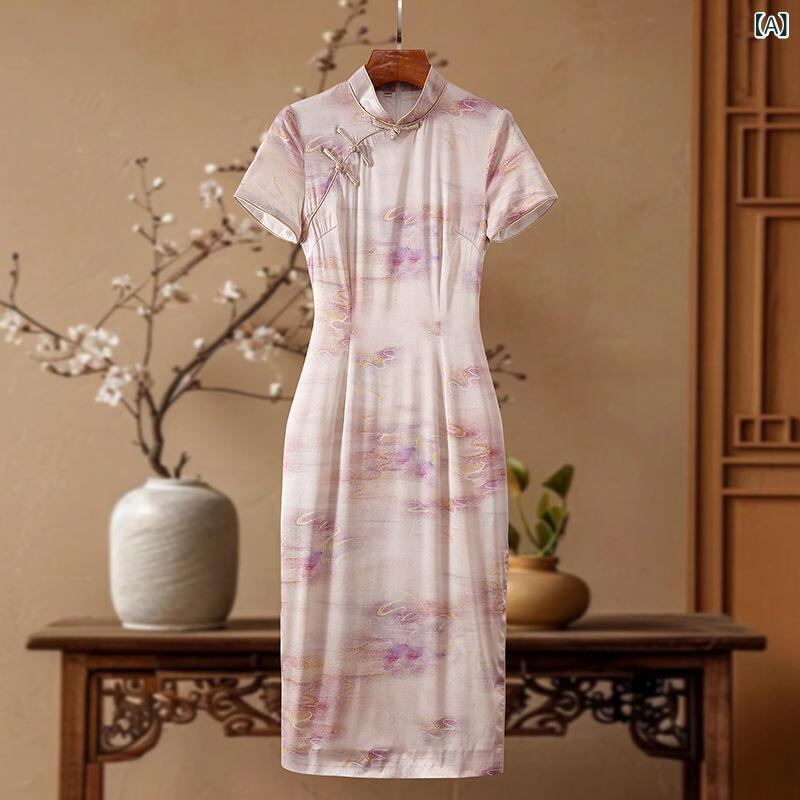 チャイナドレス レディース 桑蚕シルク 上質 レトロ モダン プリント柄 ミドル丈 半袖 スリット スタンドカラー 斜め前立て ピンク 伸縮性 夏物 普段使い エレガント チャイナ風