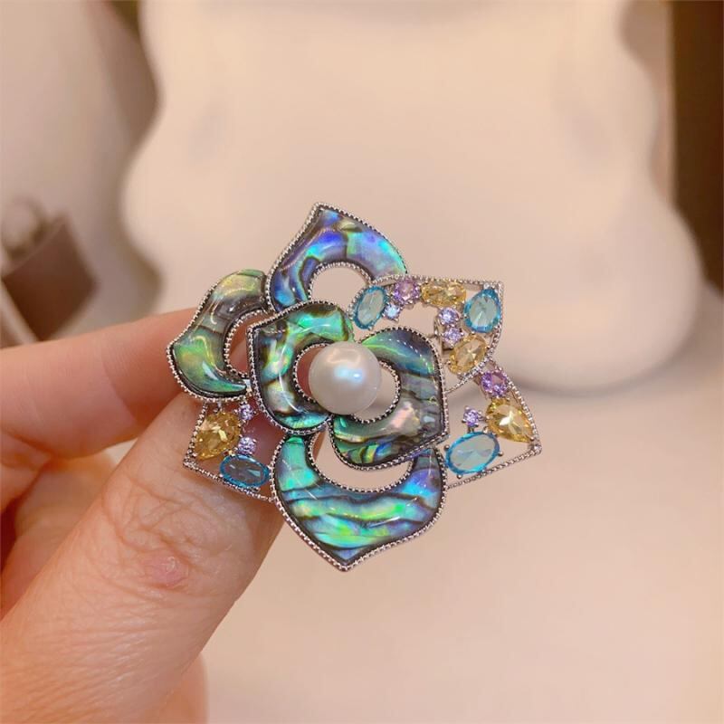 ブローチ レディース カメリア パール 花モチーフ 高級感 エレガント アワビ貝 フォーマル 結婚式 パーティー コート ジャケット 銅製 アクセサリー