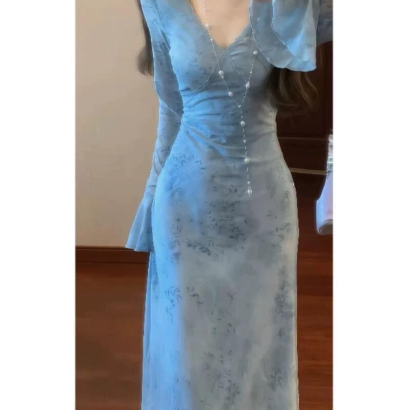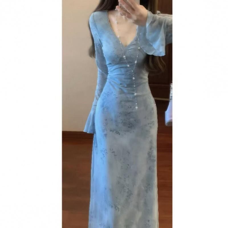 ワンピース レディース Vネック 包臀(ほうとう) 長袖 ロング丈 染め柄 プリント柄 street ファッション ブルー系 S/M/L/XLサイズ