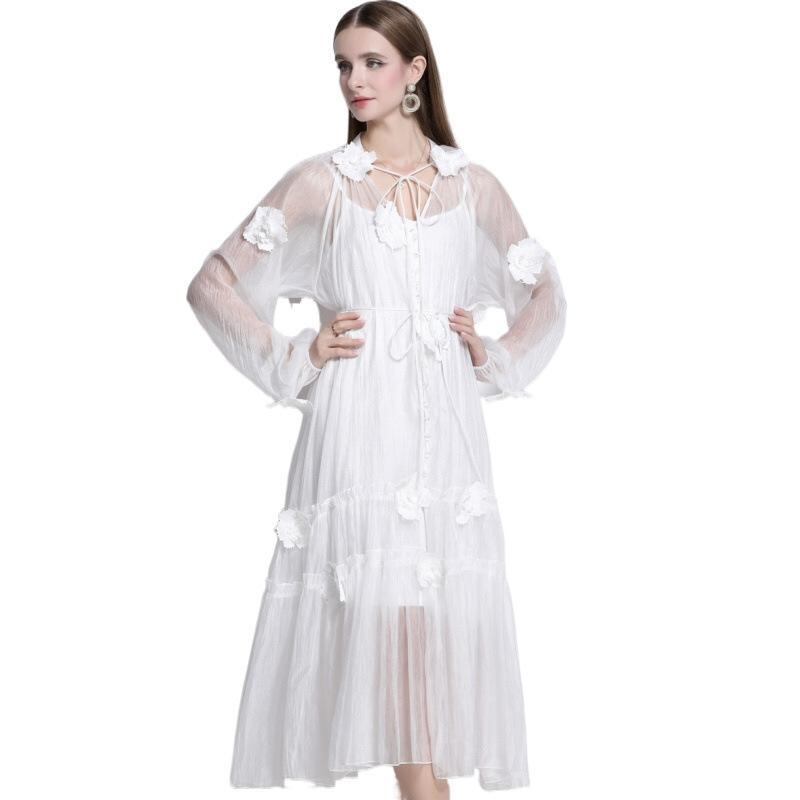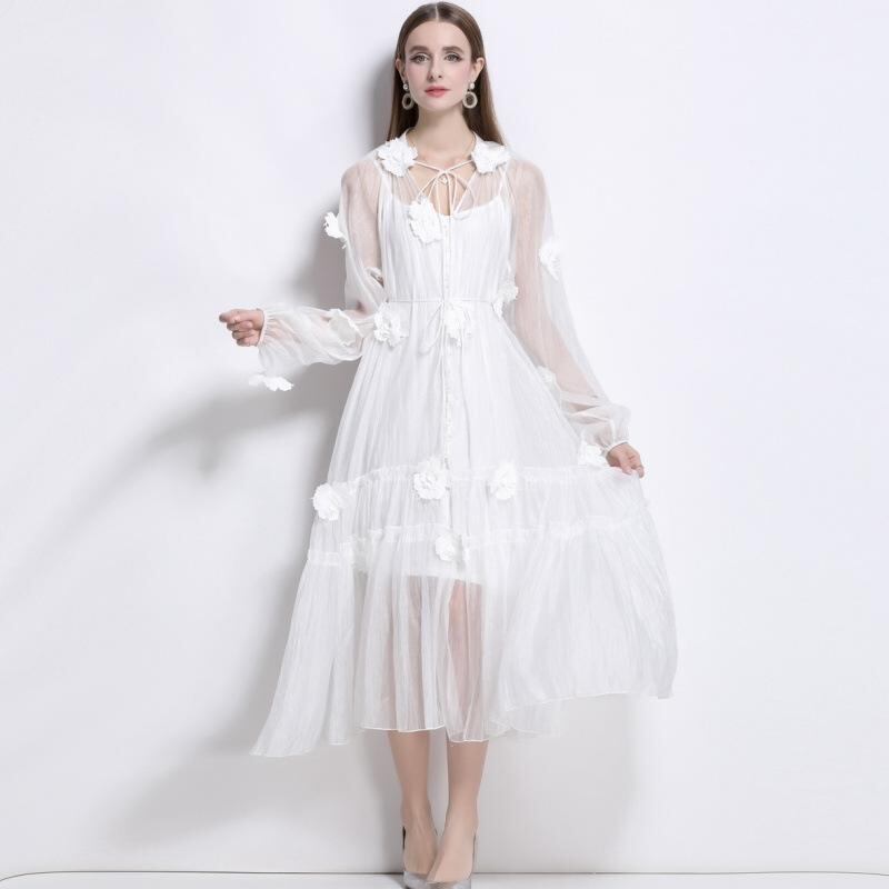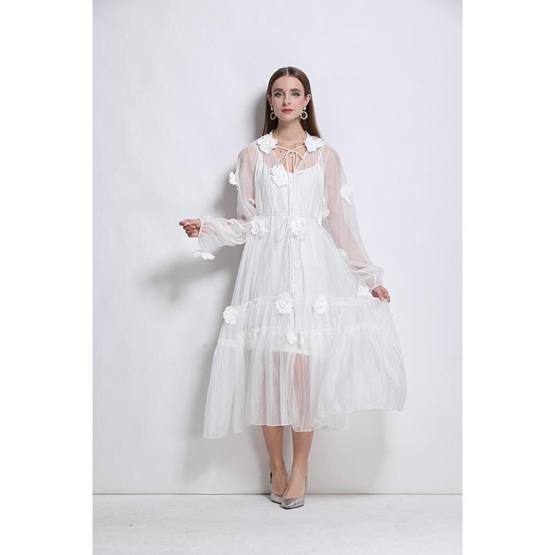 ワンピース フレンチ 上品 高級感 精巧なデザイン 立体フラワー 刺繍 リボンデザイン ロング丈 ビーチ リゾート 普段使い リネン 長袖 フリル袖 ホワイト 春夏