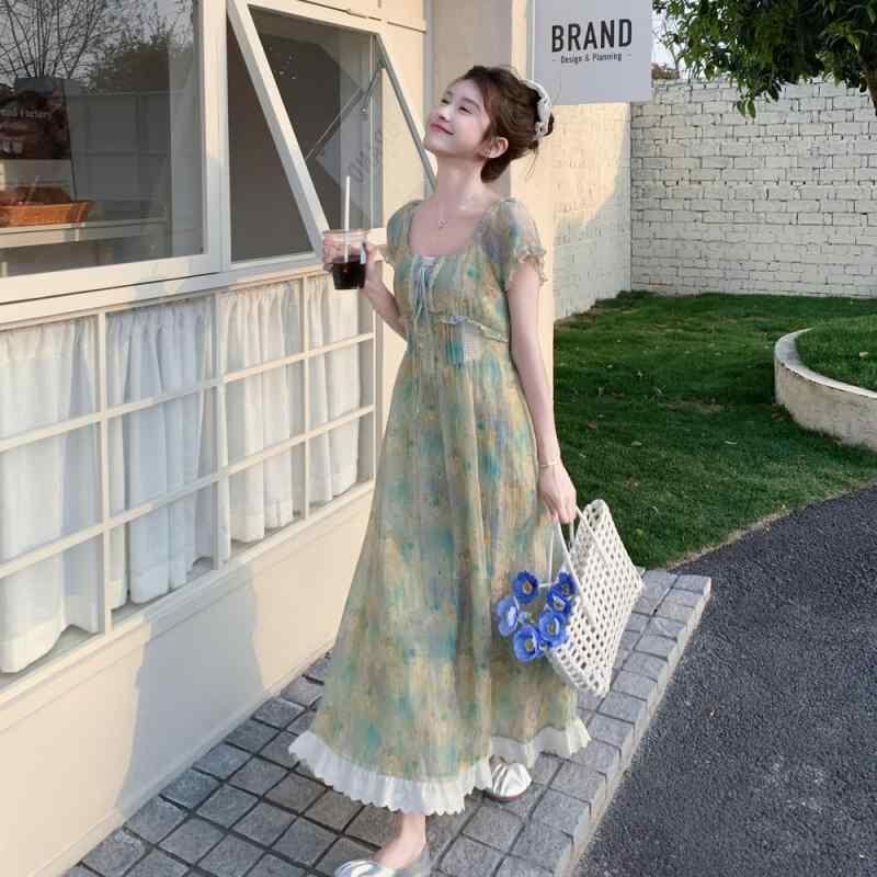 ワンピース レディース 清楚 スウィート フレンチ 花柄 ロング丈 半袖 スクエアネック Aライン ハイウエスト エレガント 若見え ポリエステル 夏 グリーン