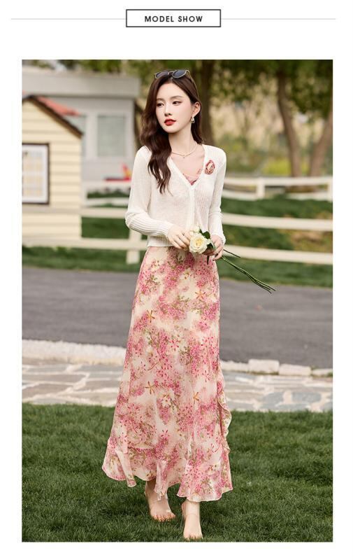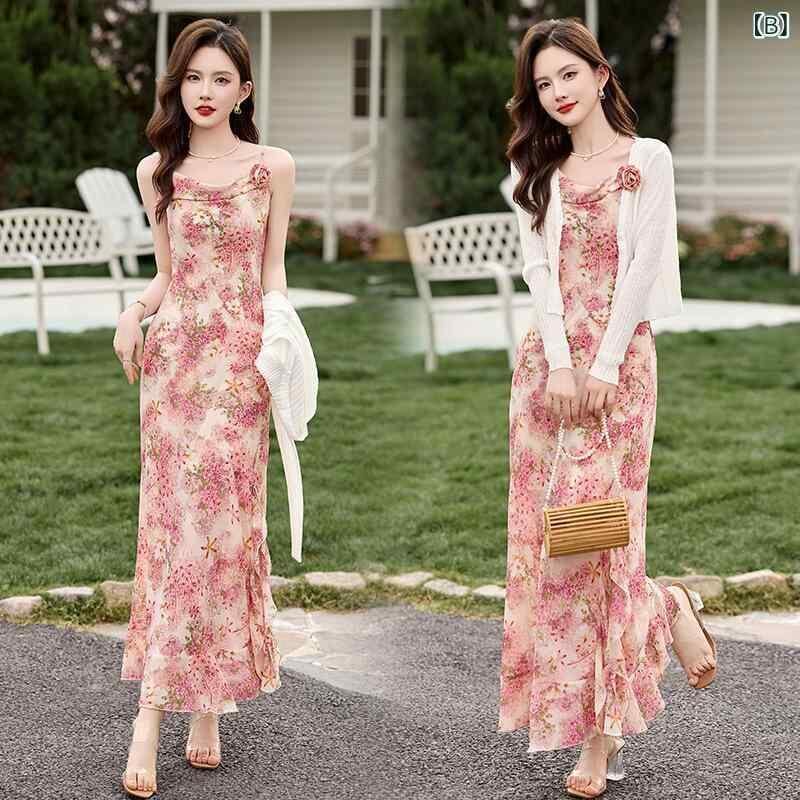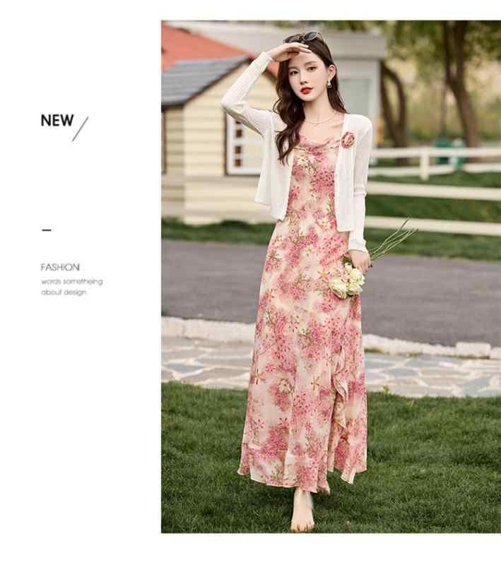 ワンピース レディース アウター 2点セット 小花柄 キャミソールワンピース ノースリーブ ロング丈 Aライン ハイウエスト ポリエステル きれいめ エレガント 通勤 オフィス 夏