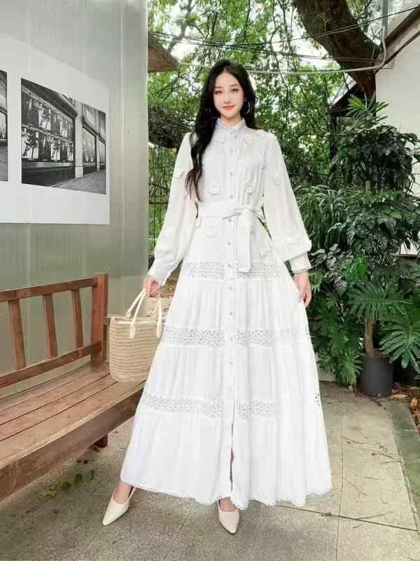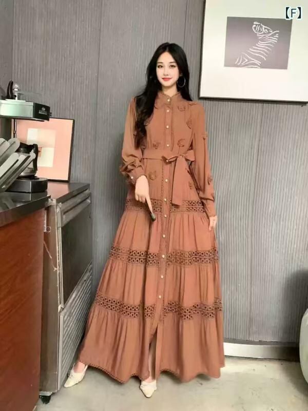 ワンピース レディース 春夏 フレンチテイスト エレガント 上品 レース 切り替え パフスリーブ 長袖 ロング丈 Aライン ハイウエスト ウエストリボン スタンドカラー 通勤 オフィス カジュアル リゾート