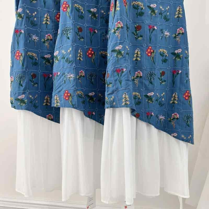 ワンピース レディース 花柄刺繍 ブルー ノースリーブ 春夏 リゾート風 切り替え レイヤード風 ロング丈 Aライン ラウンドネック エレガント 通勤