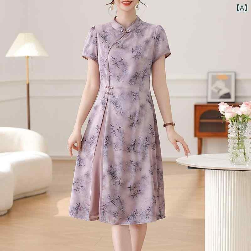 ワンピース レディース チャイナドレス 膝下丈 半袖 シェニール スパンデックス ポロ襟 パフスリーブ 上品 エレガント 高級感 伸縮性 大人 普段使い デート フォーマル 春夏 ピンク グリーン
