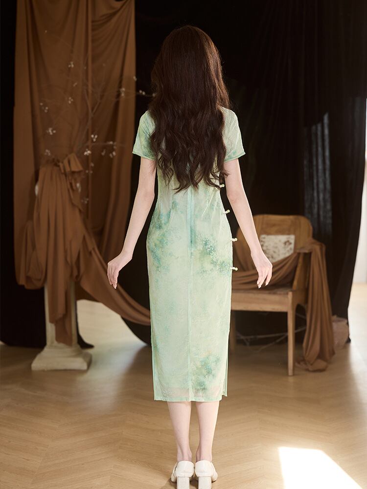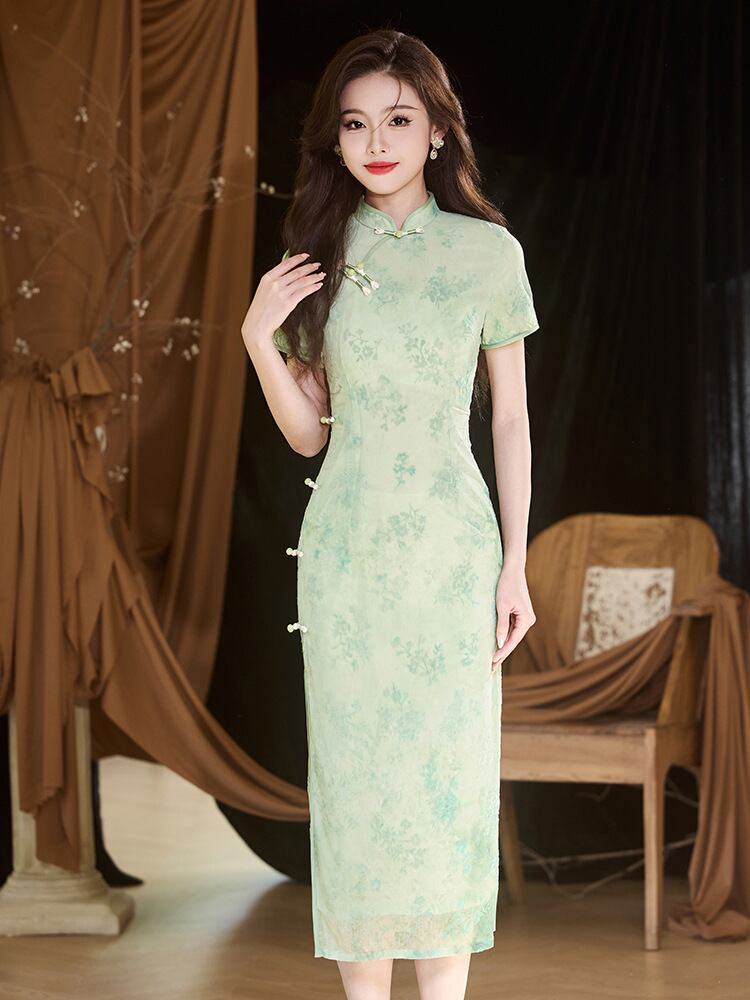 ワンピース レディース 改良型 チャイナドレス ロング丈 淡いグリーン スタンドカラー 斜め襟 五分袖 ハイサイドスリット 小柄な方用 エレガント 普段使い 春夏