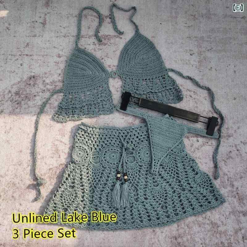 水着 レディース 手編み かぎ針編み ビキニ Tバック ショートスカート 3点セット 欧米風 セクシー スイムウェア 春夏 ビーチ プール アクリル コットン