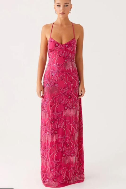 ワンピース レディース ホルターネック Vネック ノースリーブ ビーズ刺繍 スパンコール ウエストマーク Aライン ロング丈 ドレス スタイルアップ ポリエステル ストリートスタイル 春夏 ローズピンク マルチカラー