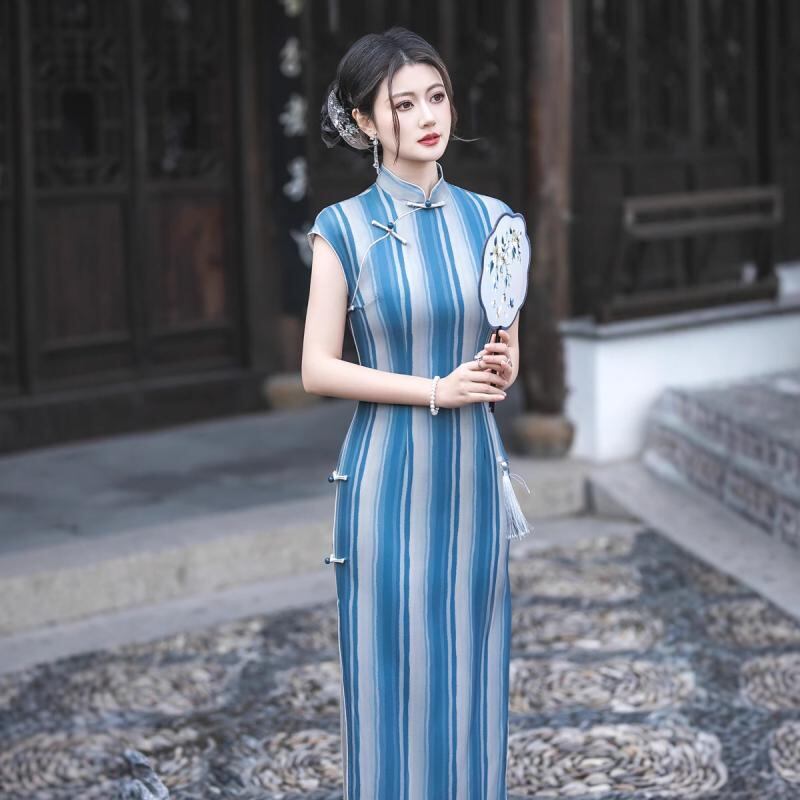 チャイナドレス ノースリーブ スタイリッシュ レディース 春夏 上品レトロ ヴィンテージ クラシック 風 ロング丈 ストライプ 着痩せ スタイルアップ 誕生日パーティー パーティー お呼ばれ 記念撮影 ワンピース ドレス