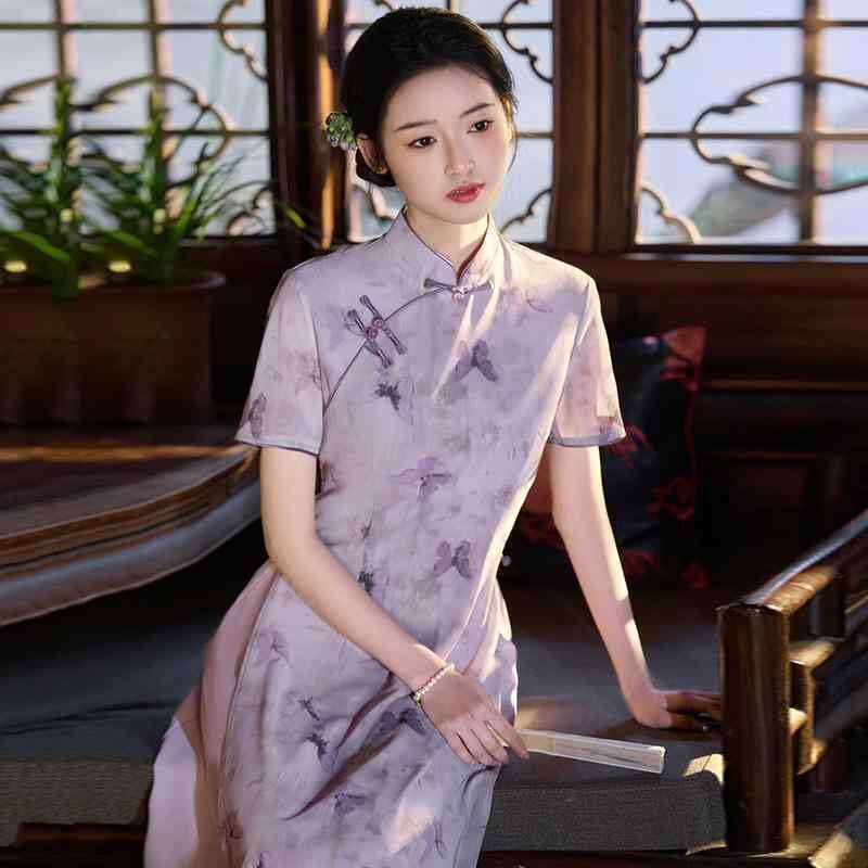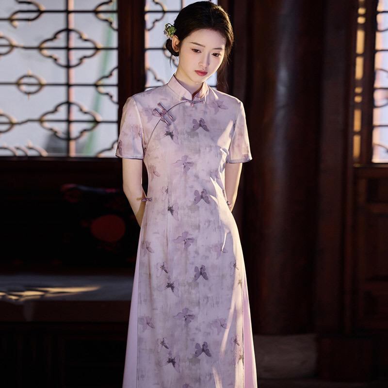 チャイナドレス レディース フェミニン スタイリッシュ 中国風 パープル 紫 細見え スタイルアップ アオザイ 若々しい 女性 レトロ ワンピース サマー 夏