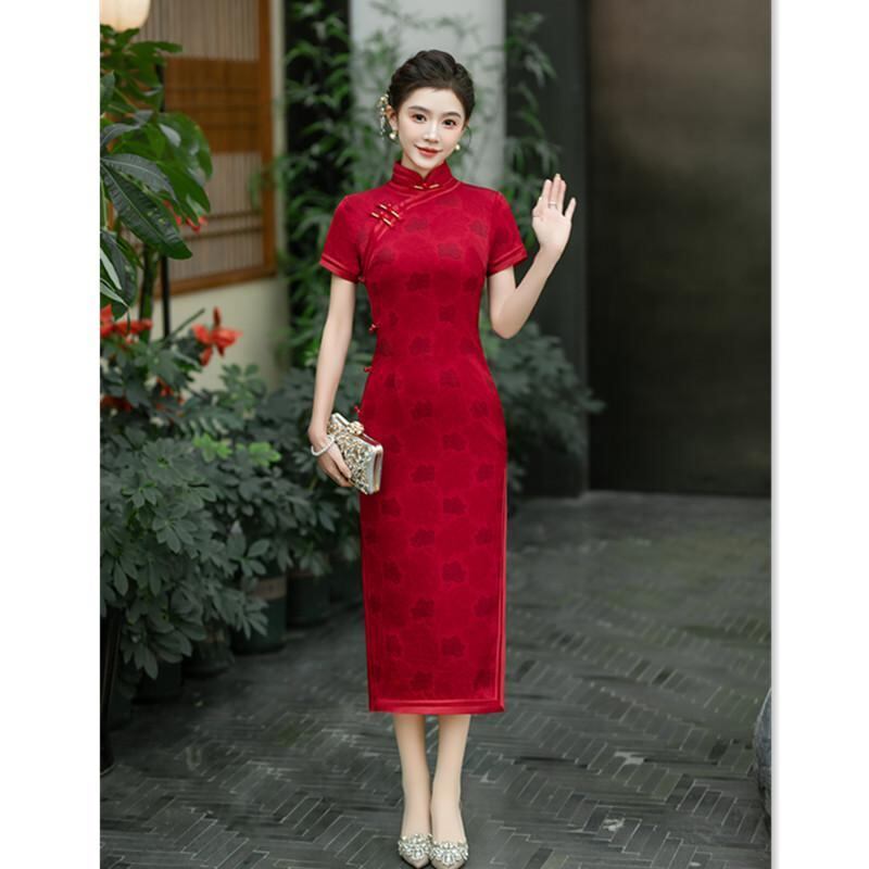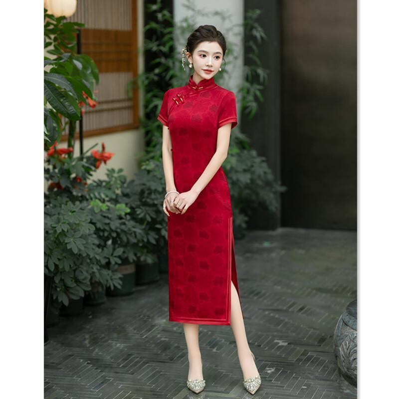 チャイナドレス レディース ミセス 結婚式 披露宴 パーティー フォーマル ロング丈 赤 レッド ポリエステル ポリウレタン 立体柄 スリット入り 五分袖 スタンドカラー レトロ 春夏