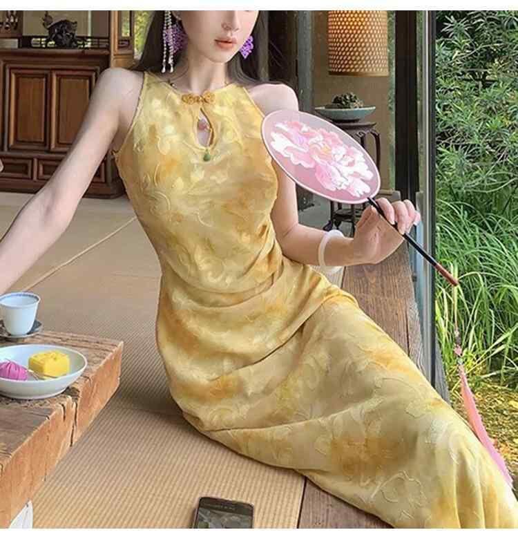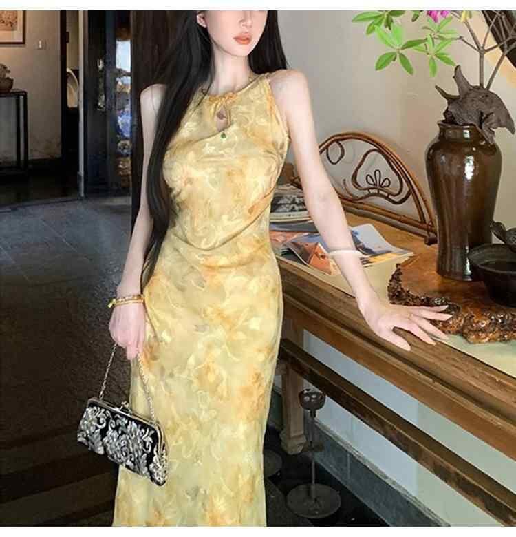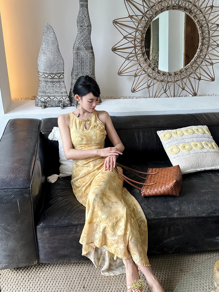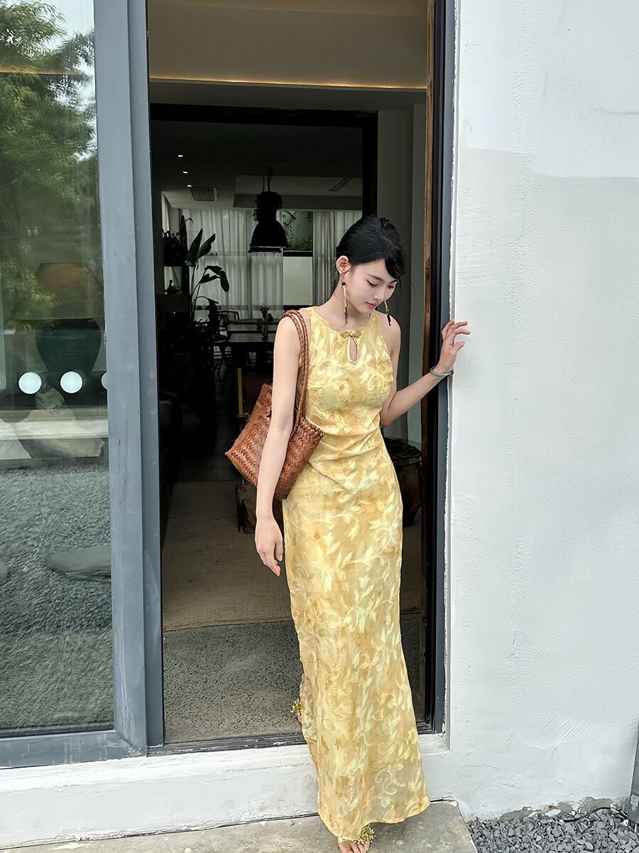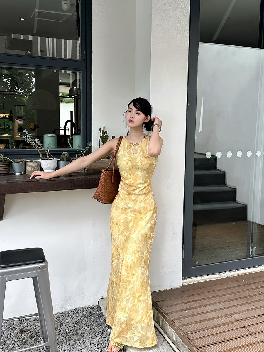チャイナドレス レディース 新中国風 改良 カットワーク オープンショルダー 花柄プリント 円ネック ハイウエスト ロング丈 エレガント 上品 オフィス 通勤ワンピース マリーゴールドカラー 春夏