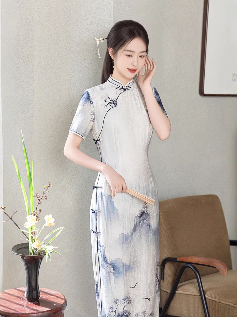 チャイナドレス レディース 春夏 新中式 モダン 改良 日常使い ロング丈 スタンドカラー 半袖 伸縮性 上品 ポリエステル 麻 ワンピース