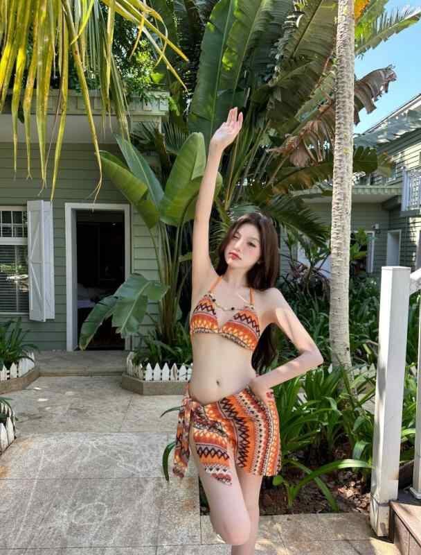 水着 レディース ビキニ 高級感 セパレート 3点セット ニット チェーン 花柄 温泉 プール 海水浴 リゾート 大人セクシー 高伸縮性 ナイロン スパンデックス素材 三角ショーツ パッド付き フェミニン