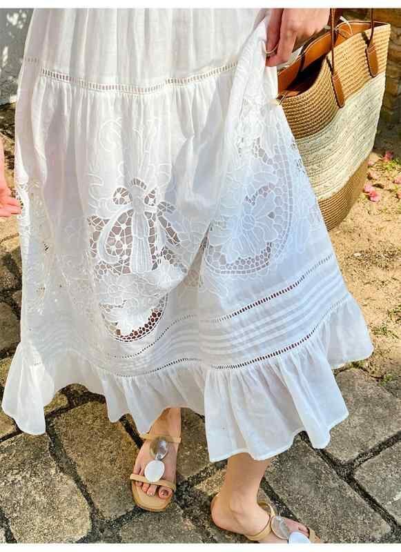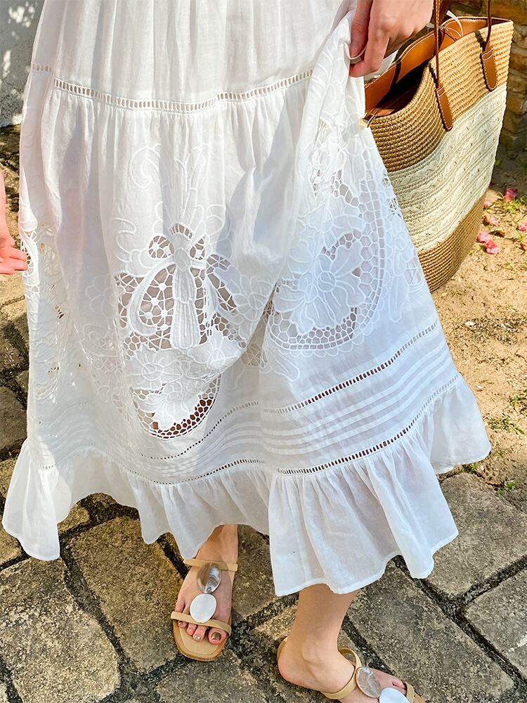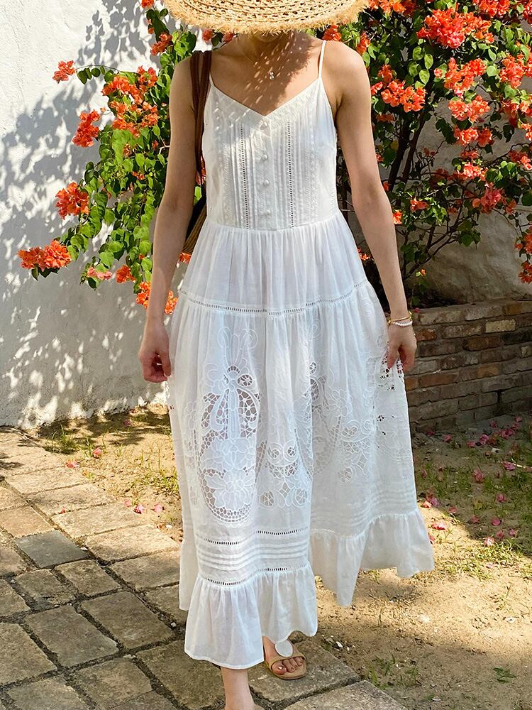 ワンピース レディース キャミソールデザイン レース ミモレ丈 Vネック ノースリーブ 背中開き フリル コットン 綿 オフホワイト リゾート ビーチ バカンス 旅行 普段使い エレガント カジュアル フェミニン 夏