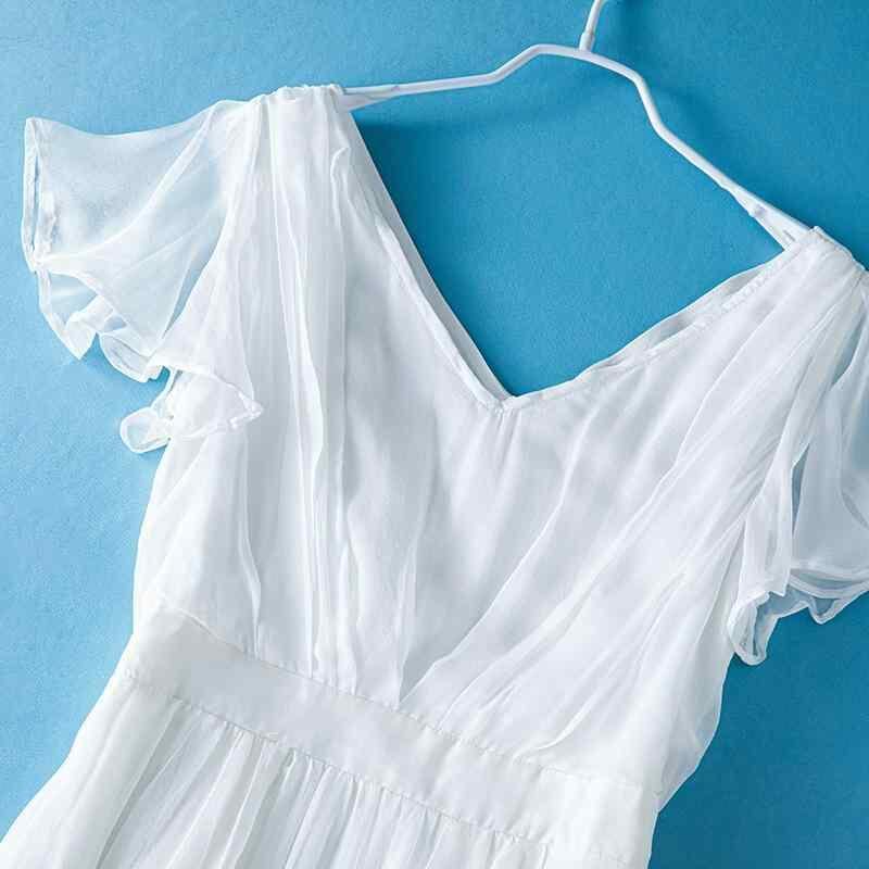 ワンピース シルク Vネック ウエストリボン ギャザー ロング丈 マキシ丈 フリル袖 半袖 着痩せ効果 無地 エレガント 上品 きれいめ 通勤 リゾート 春夏 ホワイト モーブピンク