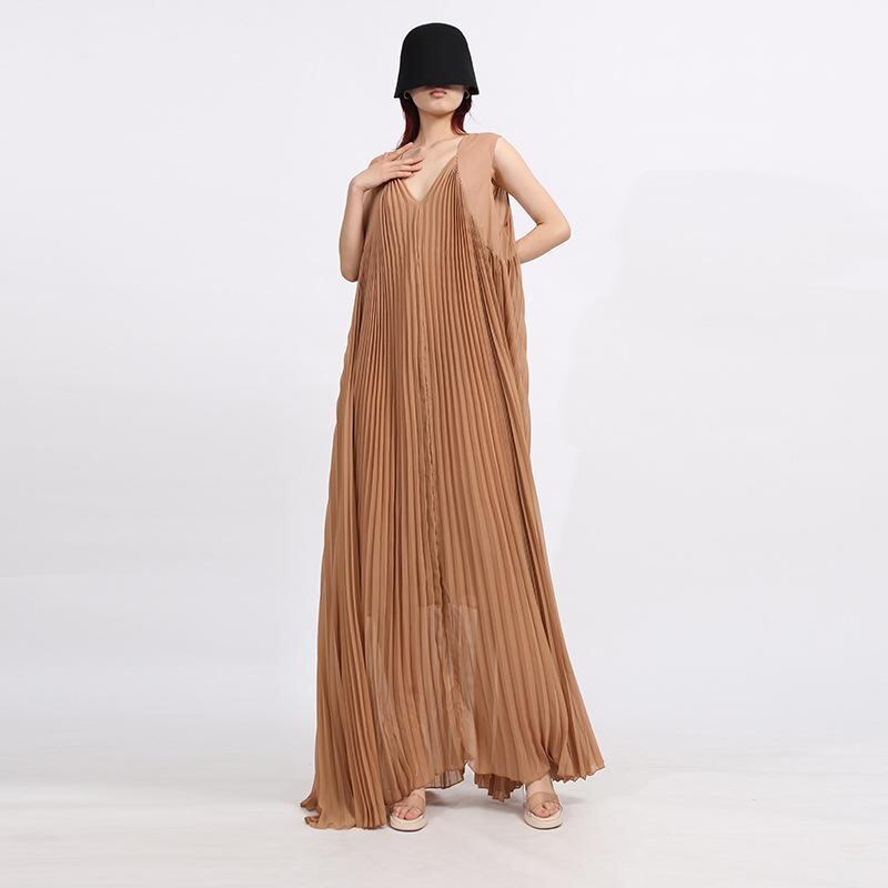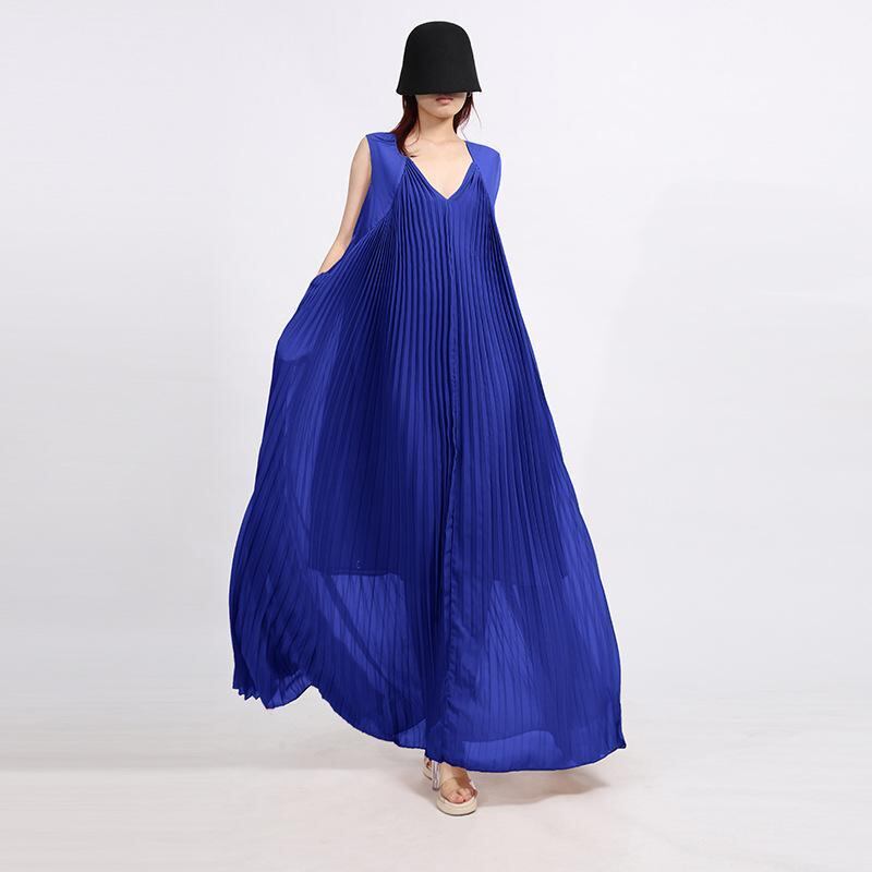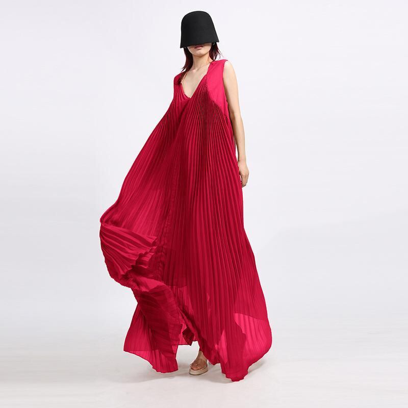 ワンピース レディース フレンチレトロ 上品 高級感 キャミソール ロング丈 Vネック ノースリーブ ハイウエスト プリーツ加工 ポリエステル 春夏 ブルー カーキ レッド