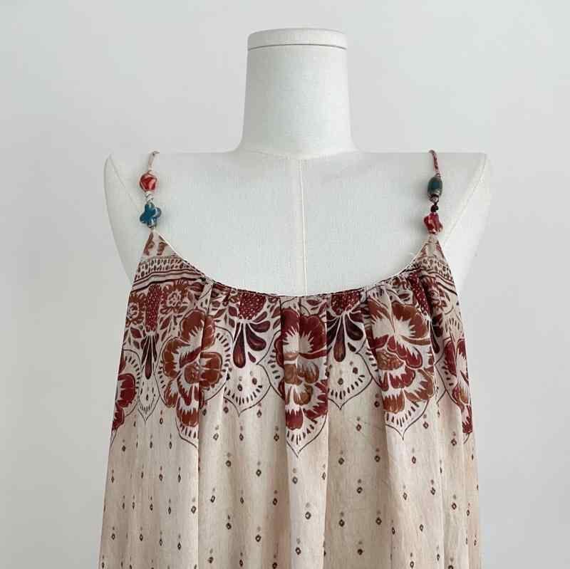 ワンピース レディース ボヘミアン エスニック 小花柄 フリンジ キャミソール プリーツ スタイルアップ ロング丈 ノースリーブ 体型カバー ゆったり ポリエステル コットン リゾート 旅行 夏