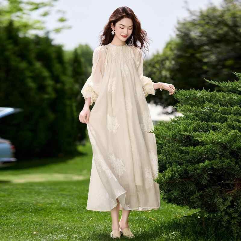 ワンピース レディース 春夏 上品 エレガント 高級感 細見え スタイルアップ スリムフィット ロング丈 無地 切り替え テンセル リヨセル 半袖 ラウンドネック きれいめ 通勤 オフィス フェミニン
