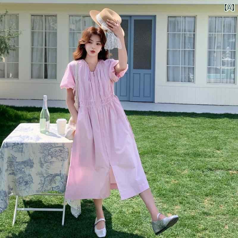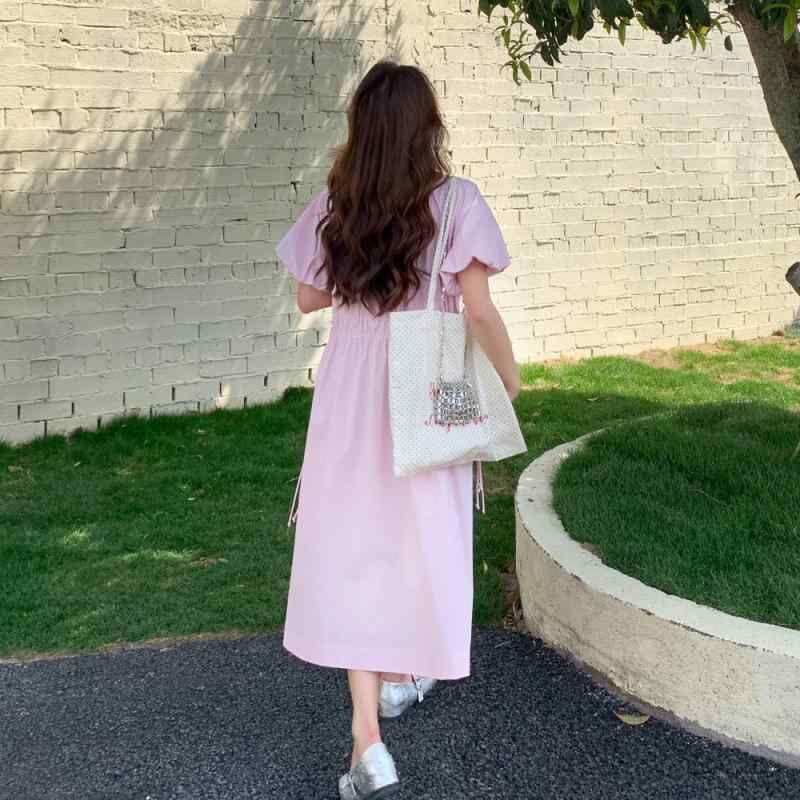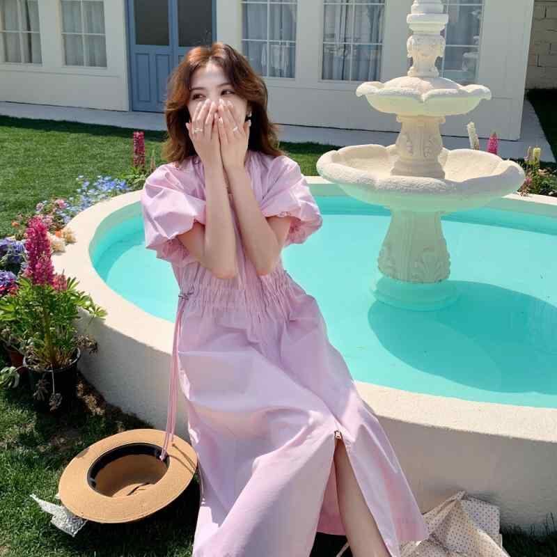 ワンピース レディース ピンク 春夏 ロマンティック スウィート 上品 エレガント Vネック 長袖 ハイウエスト Aライン ロング丈 マキシ丈 ポリエステル オフィス きれいめ 通勤