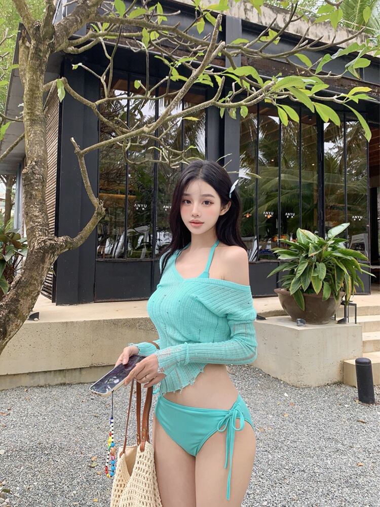 水着 レディース セパレート ビキニ 長袖 カバーアップ Vネック 透かし編み 抜け感 セクシー 薄手 ゆったり スイムウェア プール ビーチ 夏