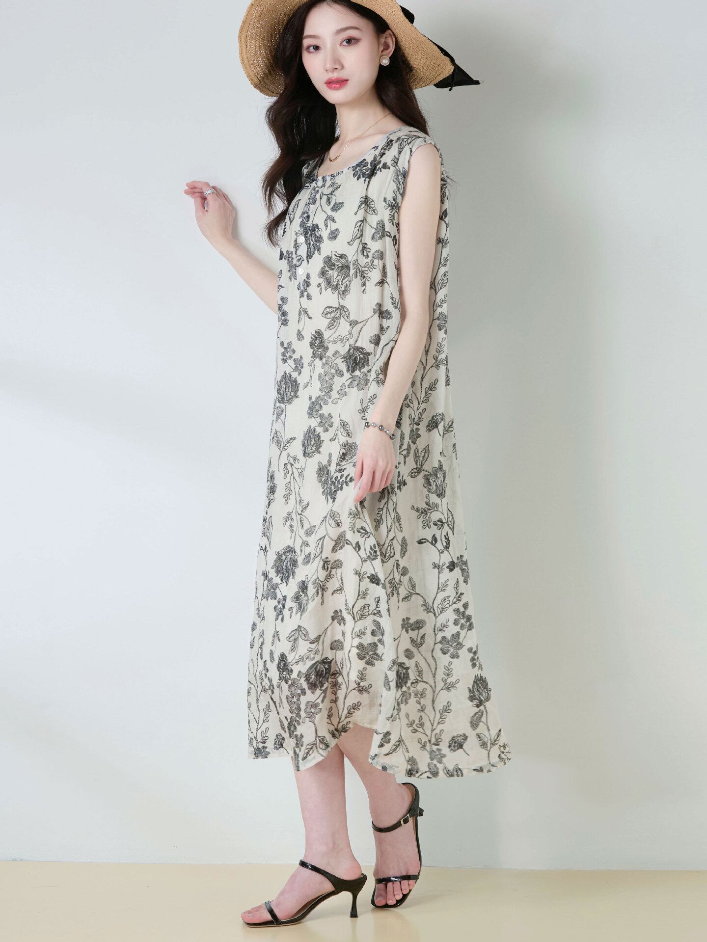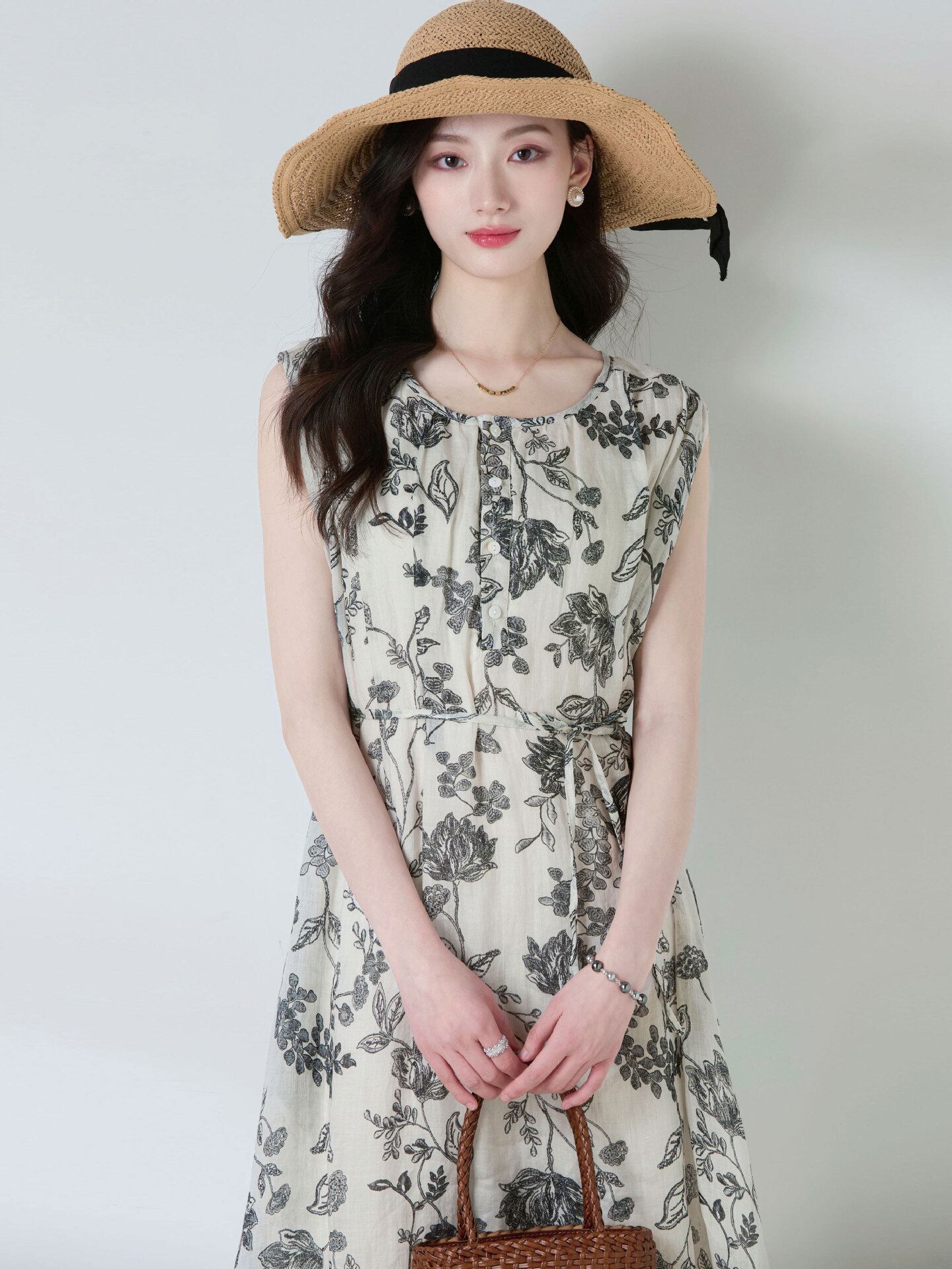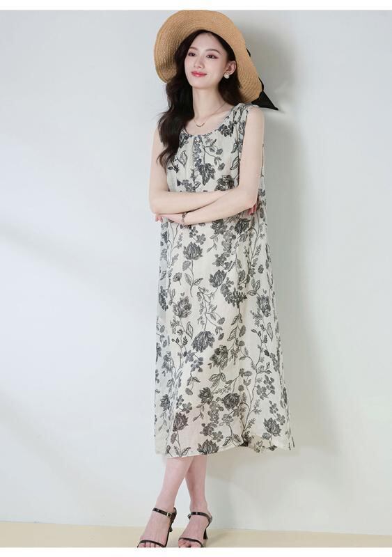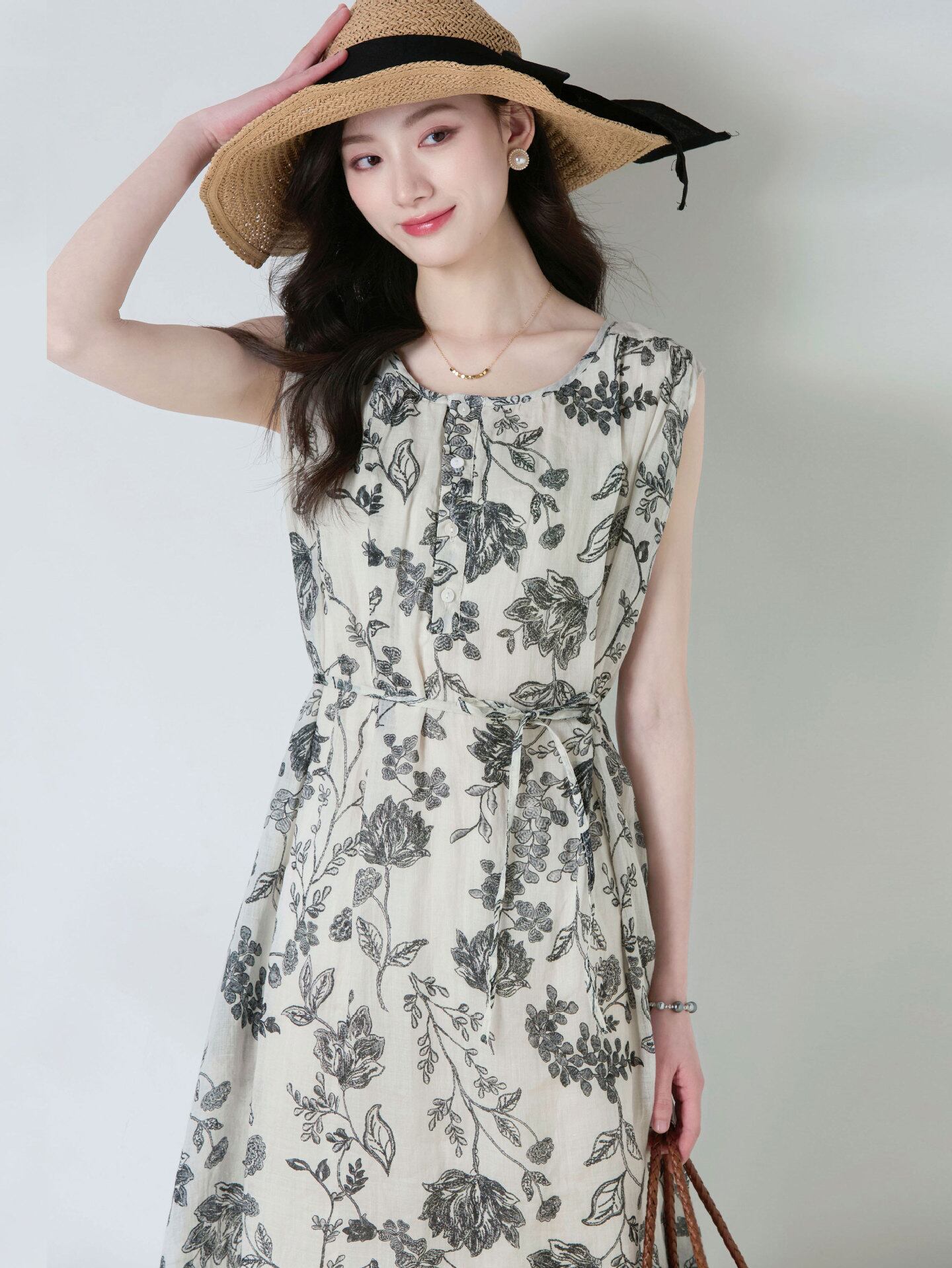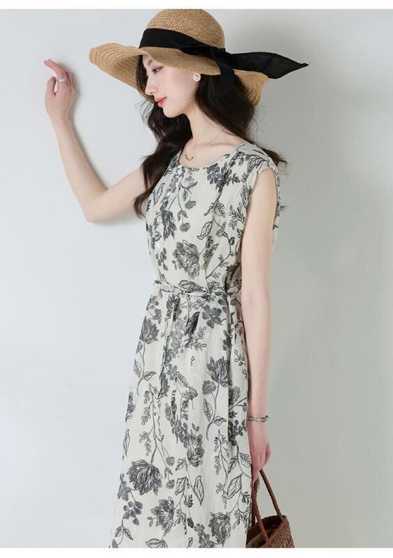 ワンピース レディース 春夏 ラミー麻 再生繊維 モノトーン花柄 プリント ラウンドネック ノースリーブ リボン ゆったり レトロ ミディ丈