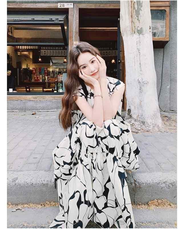 ワンピース レディース 水墨画プリント フリル ノースリーブ ロング丈 フレア 体型カバー 細見え 上品 エレガント カジュアルスタイル 春夏 ポリエステル ラウンドネック ゆったり