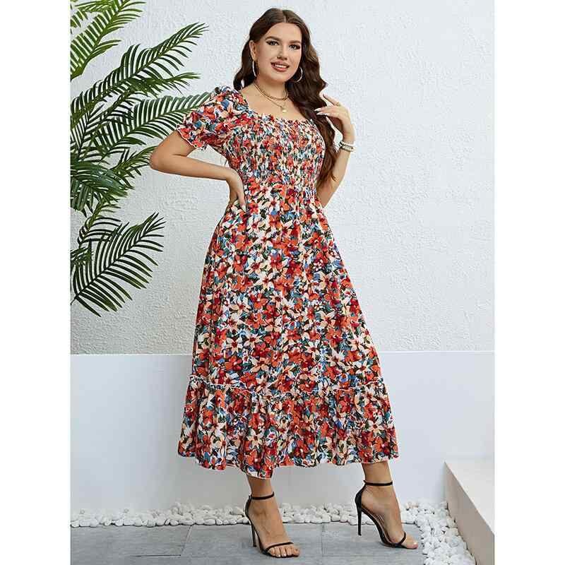 ワンピース レディース プラスサイズ Aライン 一字肩 花柄 チュニック ロング丈 半袖 泡袖 ポリエステル ゆったり 3Dプリント かわいい 清新 甘美 欧美風